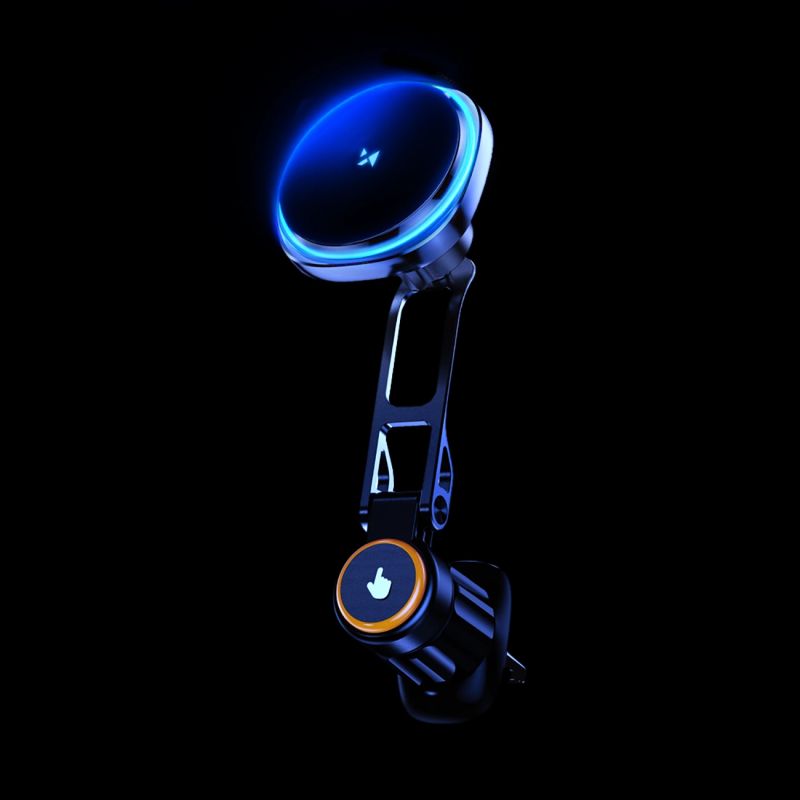 Uchwyt automatycznie rozpoczyna ładowanie bezprzewodowe z mocą do 15W zaraz po umieszczeniu telefonu. Obsługuje iPhone’y od serii 12 wzwyż oraz inne telefony z Qi – dzięki dołączonemu pierścieniowi magnetycznemu.