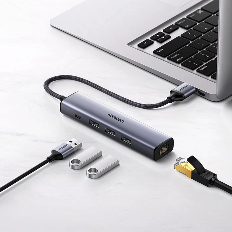 Ugreen wielofunkcyjny adapter HUB USB 3.0 - 3 x USB / Ethernet RJ-45 / USB Typ C PD szary (CM475)