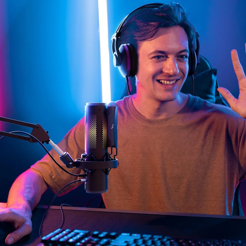 - Podświetlenie RGB: możliwość zmiany efektów wizualnych mikrofonu.