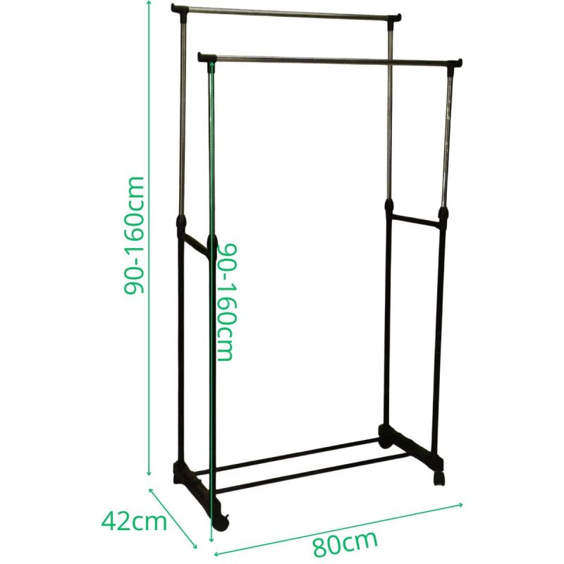 WIESZAK NA UBRANIA 80x42x90-160CM PODWÓJNY EXCELLENT HOUSEWARE to doskonałe rozwiązanie do garderoby, przedpokoju czy sypialni, gdzie potrzeba dodatkowej przestrzeni na kurtki, koszule, płaszcze i akcesoria. Dzięki podwójnym drążkom mieści więcej ubrań, a regulowana wysokość sprawia, że dopasujesz go do każdego miejsca. Mobilne kółka pozwalają łatwo przestawiać go tam, gdzie jest potrzebny.