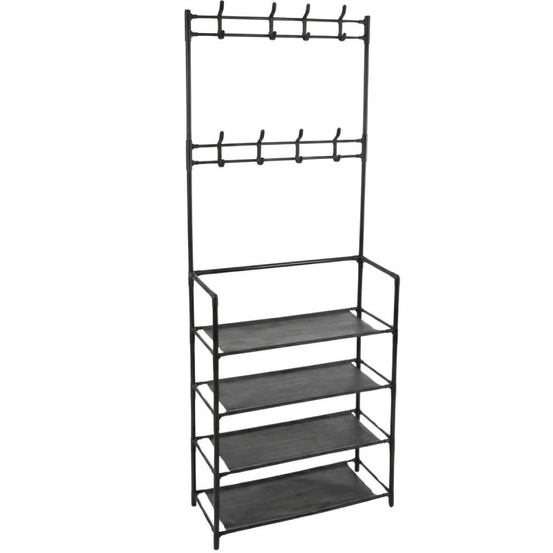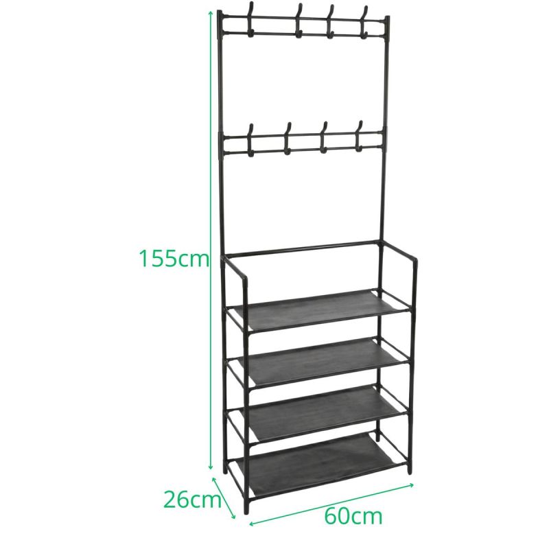 - wyposażony w 8 haczyków na ubrania i 4 półki na buty