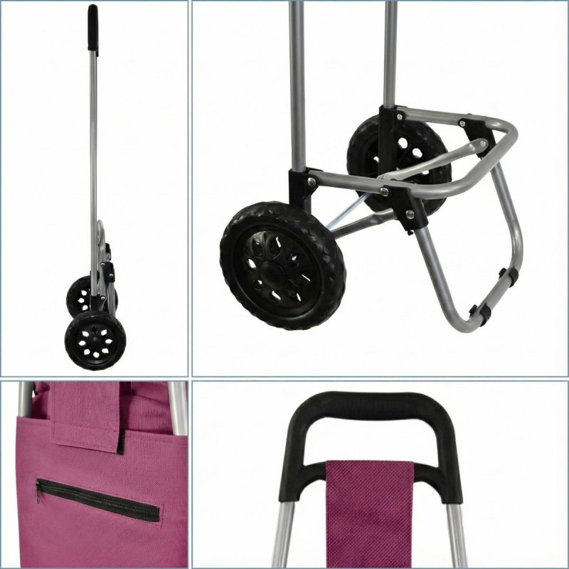 Wózek z torbą na zakupy posiada składany stelaż, co ułatwia jego przechowywanie, gdy nie jest używany. Po złożeniu zajmuje niewiele miejsca, dzięki czemu można go łatwo schować w domu, samochodzie, czy nawet w szafie.