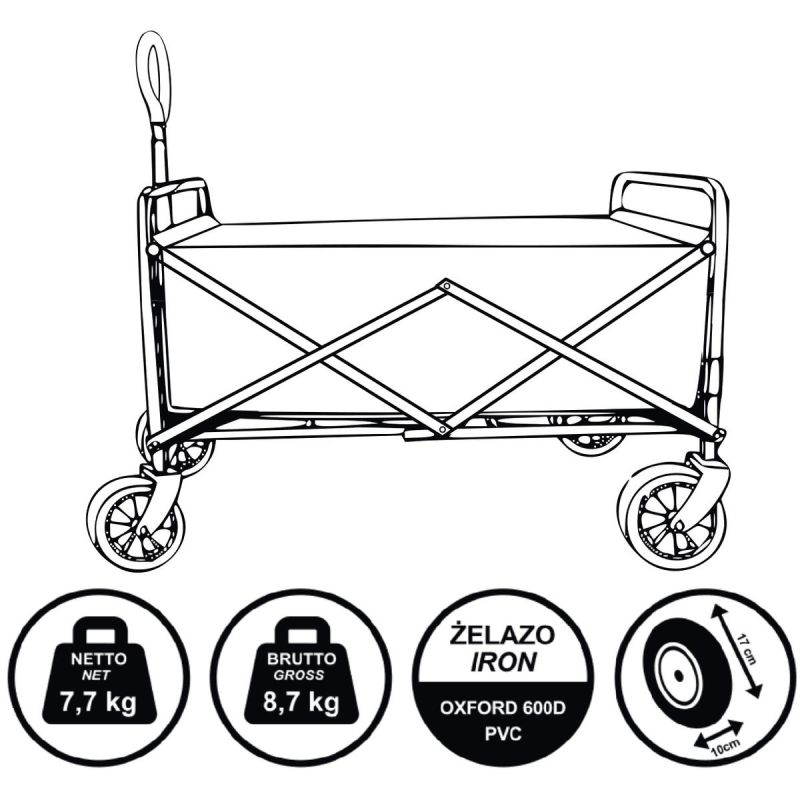 - Materiał: stalowa rama malowana proszkowo, materiał Oxford 600D, KOŁA PVC