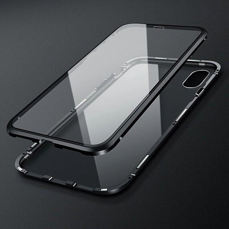 - Magnetyczna konstrukcja + szkło hartowane wbudowane w pokrowiec – etui składa się z dwóch metalowych ramek połączonych ze sobą silnymi magnesami oraz szkła hartowanego, które znajduje się na przedniej i tylnej części pokrowca.
