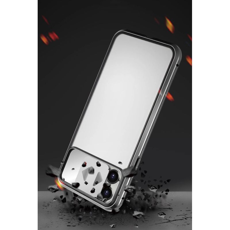 Etui składa się z dwóch metalowych ramek połączonych ze sobą silnymi magnesami oraz szkła hartowanego, które znajduje się na przedniej i tylnej części pokrowca.