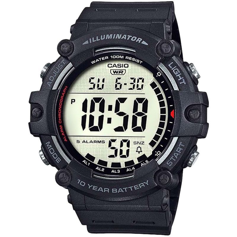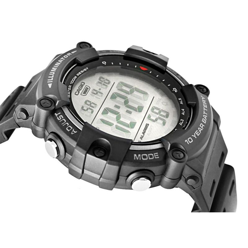 - Tarcza: Kwarcowa. Automatyczny kalendarz: rozbudowany datownik, który automatycznie dopasowuje datę w przypadku krótszych miesięcy; Timer: możliwość odliczania od zaprogramowanego czasu do zera; Zegar 12/24: możliwość wyświetlania godziny w trybach 12 i 24 godzinnych; Stoper: 1/100 mierzy czas do jednej setnej sekundy; Dual-Time: możliwość ustawienia drugiego niezależnego czasu; Alarm: zegarek może sygnałem dźwiękowym informować 5 razy w ciągu doby, w tym tryb drzemki oraz opcja sygnalizacji o pełnych godzinach; Iluminator: możliwość podświetlenia tarczy diodą LED, wytrzymałóśc baterii: 10 lat