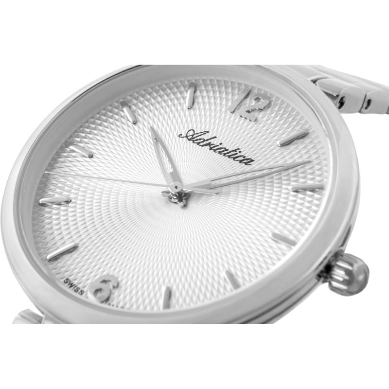 Zbliżenie na tarczę tego zegarka to prawdziwa uczta dla oka. Hipnotyzujący, giloszowany wzór w centrum układa się w geometryczne promienie, które przy każdym ruchu nadgarstka łapią światło, tworząc falujący efekt. Srebrne wskazówki zostały zaprojektowane z kobiecą lekkością – płynnie przesuwające się po tarczy z zegarmistrzowską precyzją. Indeksy godzinowe przybierają postać minimalistycznych, wypukłych znaczników, idealnie wkomponowanych w strukturę tarczy. Całość dopełniają: nazwa Adriatica na tarczy, i dyskretne logo na zapięciu bransolety oraz na koronce zegarka.