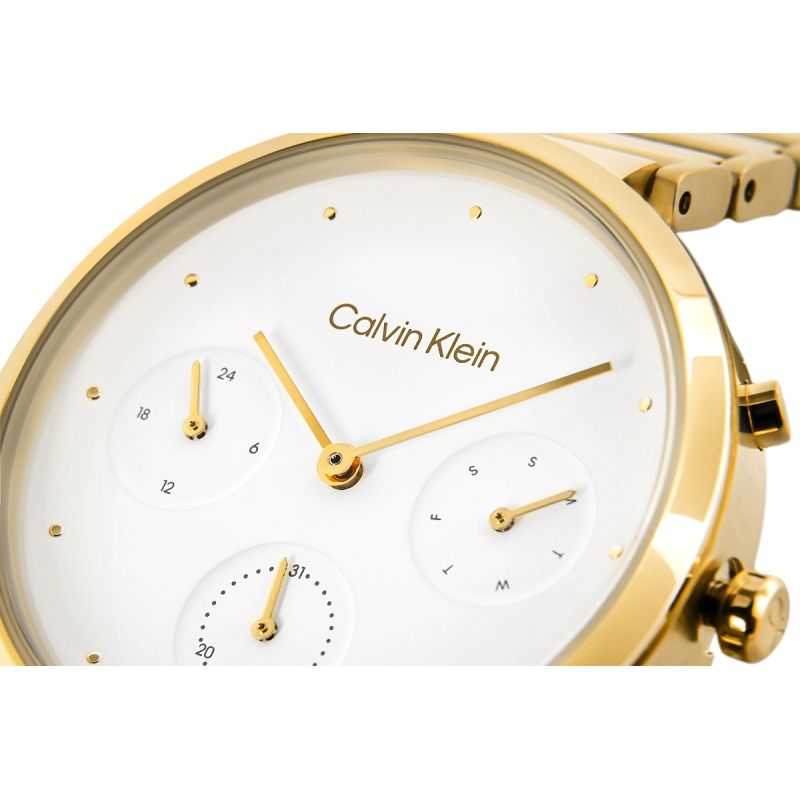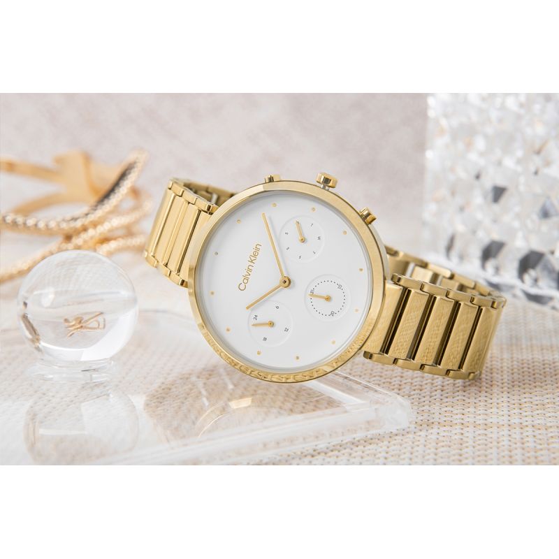 Precyzyjne wskazówki, punktowe indeksy i tarcza, która miękko odbija światło – wszystko razem tworzy kompozycję, od której trudno oderwać wzrok. Wysokiej jakości materiały, dopracowane z zegarmistrzowską precyzją detale i perfekcyjnie skomponowana kolorystyka – zegarek Calvin Klein nosi się jak biżuterię, a każdy rzut oka na nadgarstek staje się estetycznym przeżyciem. Całość dopełniają: logo na tarczy, zapięciu bransolety oraz CK na koronce zegarka.