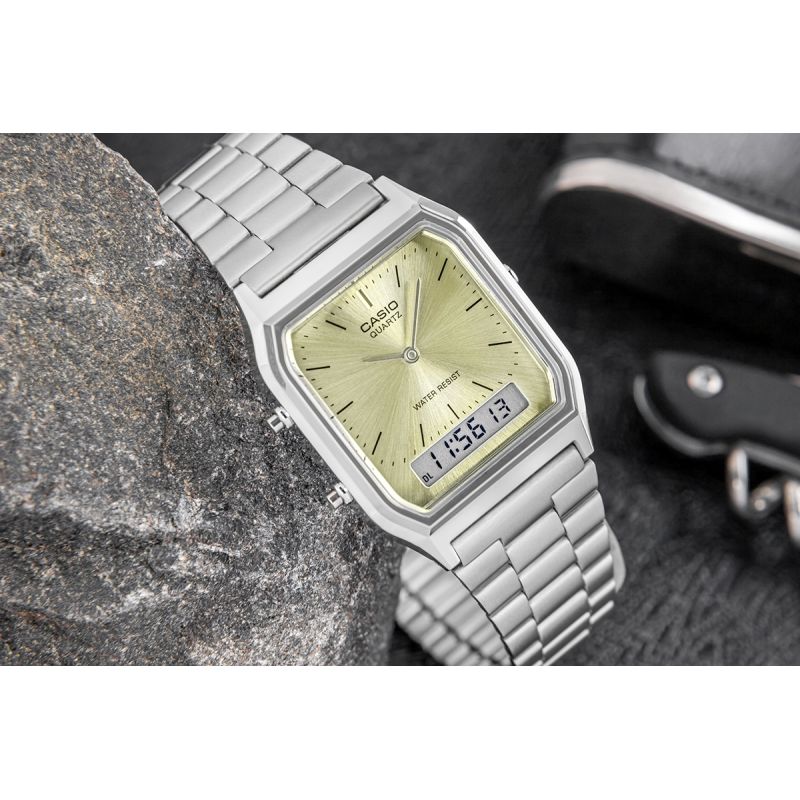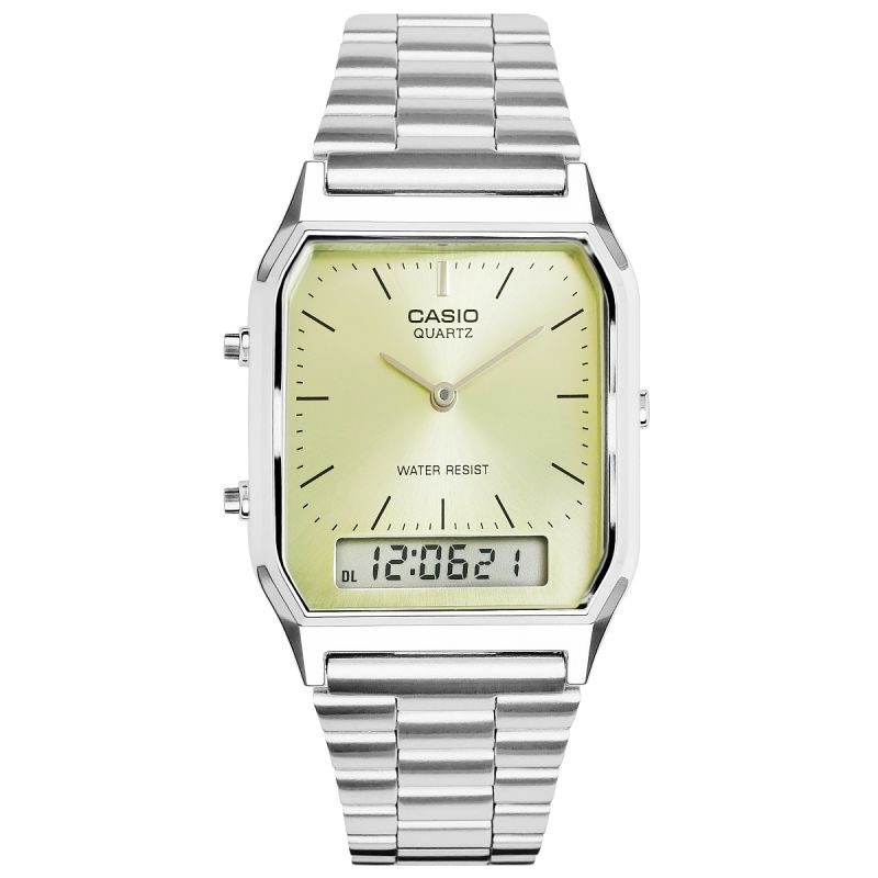 Uroczo klasyczny, modnie kolorowy - kultowy zegarek CASIO w odświeżonej palecie najnowszych trendów kolorystycznych! Retro prostota spotyka się tutaj z nowoczesną funkcjonalnością w zegarku analogowym z małym cyfrowym okienkiem, które zapewnia szybki dostęp do najważniejszych informacji. Zegarek umożliwia śledzenie dwóch stref czasowych, a funkcje takie jak stoper, alarm i automatyczny kalendarz sprawiają, że zegarek ten doskonale sprawdza się w rytmie współczesnego życia. Uniwersalny, elegancki design sprawia, że zegarek doskonale pasuje zarówno na formalne uroczystości, jak i na codzienne wyjścia.Idealny wybór dla tych, którzy cenią styl vintage, ale nie chcą rezygnować z nowoczesnych rozwiązań.