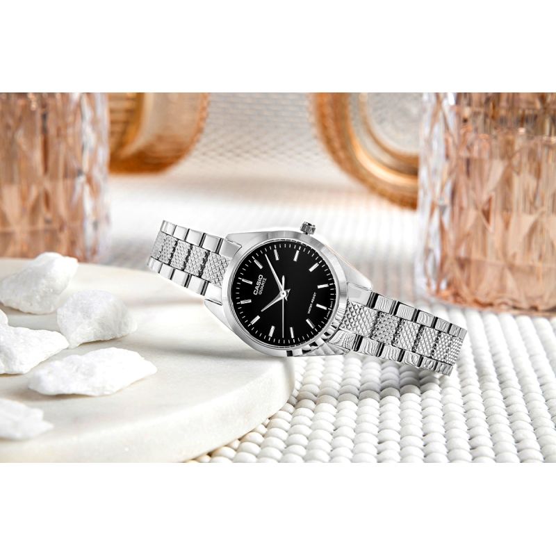CASIO LTP-1274D-7ADF to kwintesencja klasycznej prostoty, zaprojektowanej z myślą o codziennej elegancji. Biała tarcza z cienkimi indeksami i smukłymi wskazówkami emanuje spokojem i przejrzystością, idealnie wpisując się w minimalistyczny styl. Okrągła koperta i lśniąca bransoleta ze stali nierdzewnej tworzą lekką, harmonijną całość, która pięknie układa się na nadgarstku. To zegarek, który naturalnie dopasowuje się do Ciebie – dyskretny, wygodny i zawsze na miejscu.