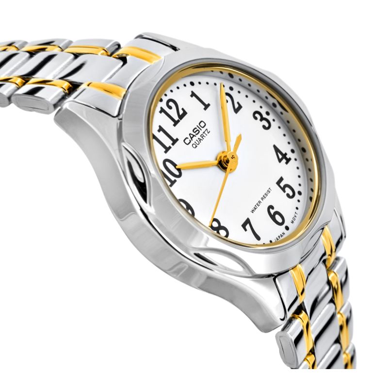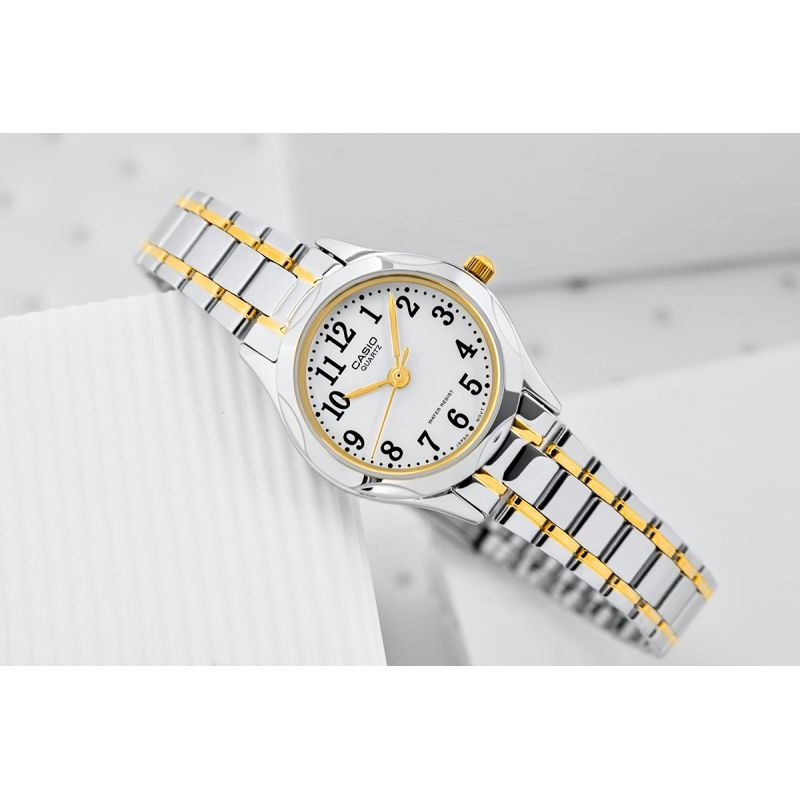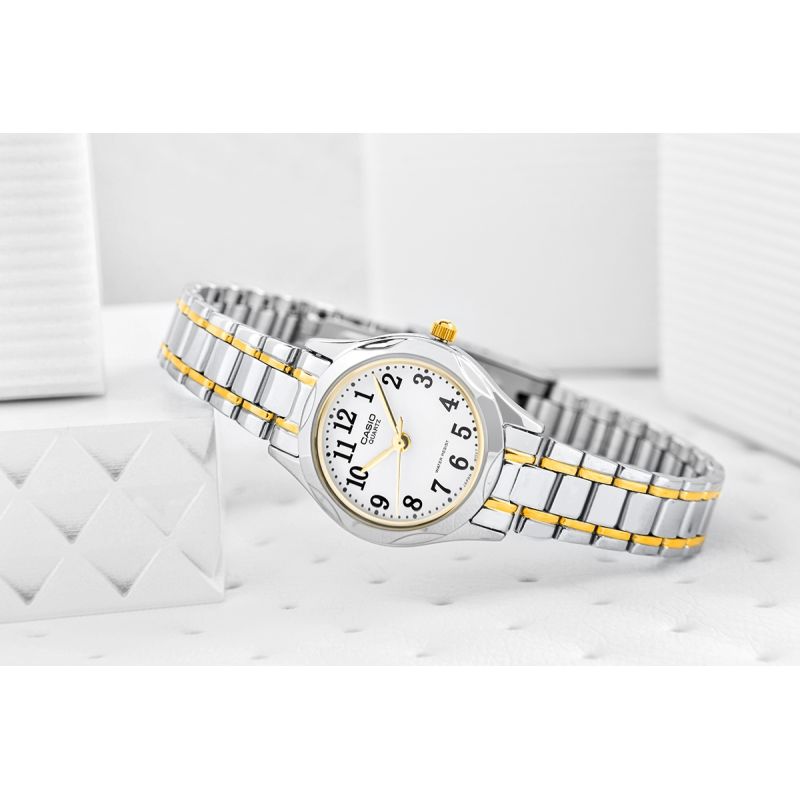 Ten model zegarka CASIO to idealny wybór dla kobiet o drobnej, delikatnej dłoni, subtelnie podkreślający jej smukłość i elegancję. Dzięki kompaktowej kopercie i lekkiej konstrukcji, nosi się go niemal jak biżuterię – jest wygodny, stylowy i niezwykle ponadczasowy. To doskonały prezent na Komunię Świętą – jego klasyczny design sprawia, że będzie pasował zarówno do młodej damy, jak i kobiety, która ceni sobie subtelną elegancję.Minimalistyczna tarcza w klasycznym białym kolorze z czytelnymi czarnymi cyframi zapewnia maksymalną przejrzystość, a srebrno-złote wykończenie dodaje mu luksusowego charakteru.