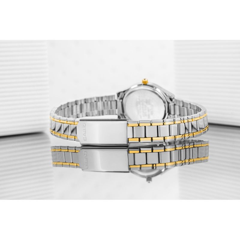 Bransoleta wykonana jest z lśniącej stali nierdzewnej w srebrnym odcieniu ze złotymi akcentami, które subtelnie podkreślają luksusowy wygląd zegarka. Kontrast pomiędzy chłodnym blaskiem srebra a ciepłym połyskiem złota sprawia, że model ten prezentuje się niezwykle szykownie i ponadczasowo. To doskonałe rozwiązanie dla kobiet, które cenią sobie uniwersalność biżuteryjnych dodatków, a jednocześnie chcą dodać swojemu wyglądowi odrobiny luksusu. Całość dopełnia subtelne logo CASIO na zapięciu bransolety.