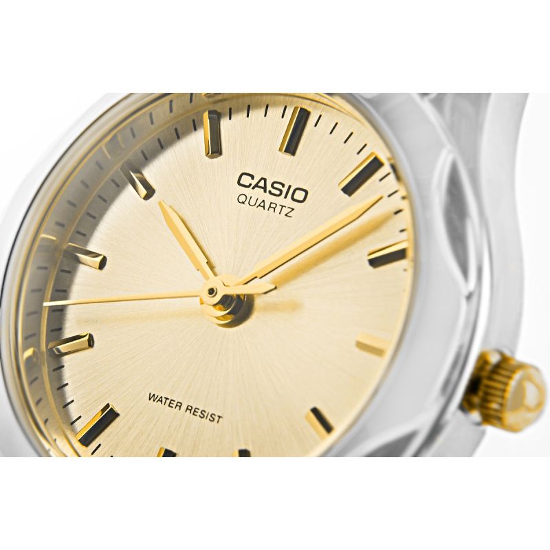 Bransoleta wykonana jest z lśniącej stali nierdzewnej w srebrnym odcieniu ze złotymi akcentami, które subtelnie podkreślają luksusowy wygląd zegarka. Kontrast pomiędzy chłodnym blaskiem srebra a ciepłym połyskiem złota sprawia, że model ten prezentuje się niezwykle szykownie i ponadczasowo. To doskonałe rozwiązanie dla kobiet, które cenią sobie uniwersalność biżuteryjnych dodatków, a jednocześnie chcą dodać swojemu wyglądowi odrobiny luksusu. Całość dopełnia subtelne logo CASIO na zapięciu bransolety.