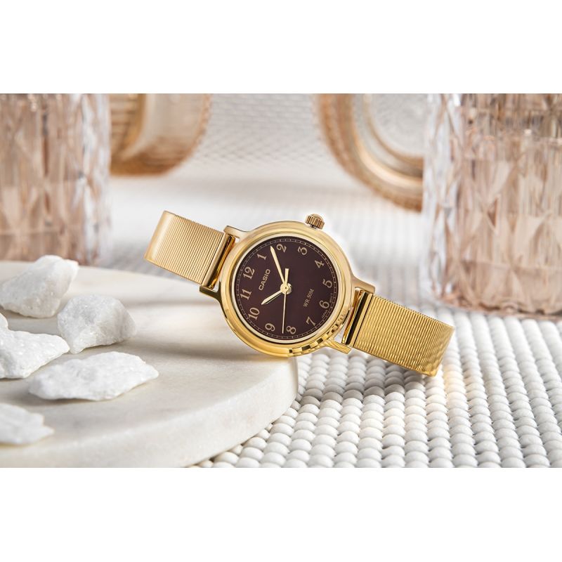 Zegarek CASIO LTP‑B170G‑5BVDF to coś więcej niż tylko praktyczny dodatek – to subtelna biżuteria, która każdego dnia dyskretnie podkreśla kobiecy styl i charakter. Jego klasyczna forma, złocisty połysk i głęboka, brązowa tarcza sprawiają, że z łatwością dopełnia zarówno codzienne, jak i bardziej eleganckie stylizacje. To wybór dla kobiet, które cenią ponadczasową elegancję, niezawodność i detale tworzące prawdziwą klasę. Wodoodporność do 50 metrów daje Ci swobodę – nawet niespodziewany deszcz nie zakłóci Twojego rytmu dnia.