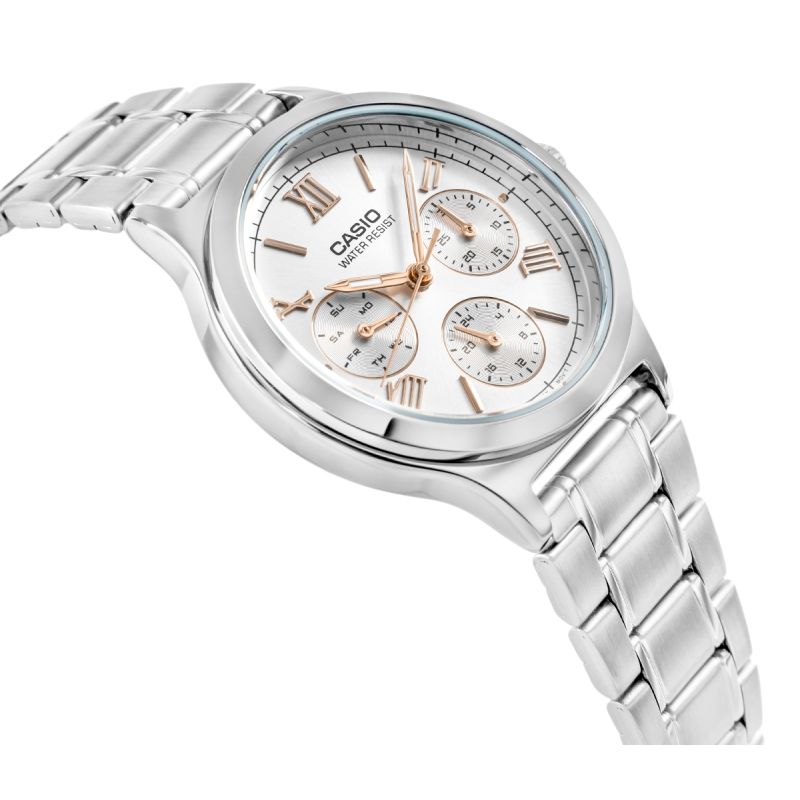 Zegarek CASIO to połączenie luksusowego wyglądu i codziennej funkcjonalności. Jego elegancka bransoleta i dopracowana tarcza z delikatnym połyskiem sprawiają, że przyciąga wzrok i doskonale komponuje się z kobiecymi stylizacjami. Trzy dodatkowe subtarcze wskazują dzień tygodnia, datę i czas 24-godzinny, dzięki czemu zawsze masz wszystko pod kontrolą. To zegarek, który nie tylko zdobi nadgarstek, ale też ułatwia organizację dnia. Idealny dla kobiet, które lubią styl i wygodę w jednym.