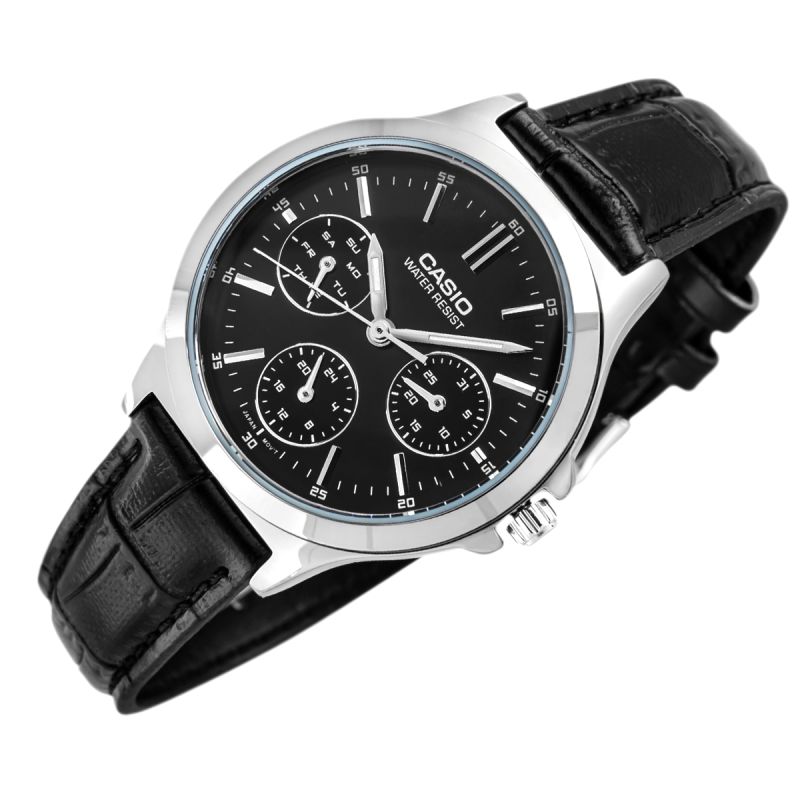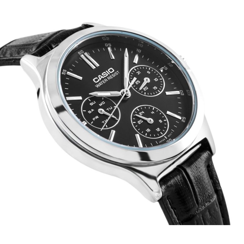 Ten zegarek CASIO to elegancja w najczystszej formie – klasyczna czerń zestawiona z połyskującą stalą tworzy ponadczasowy duet, który pasuje do każdej kobiecej stylizacji. Tarcza z delikatnym, matowym wykończeniem i smukłymi indeksami emanuje minimalizmem i wyrafinowaniem. Trzy subtelne subtarcze wskazują dzień tygodnia, datę oraz godzinę w formacie 24-godzinnym, co dodaje mu nie tylko uroku, ale też praktyczności. Skórzany pasek o fakturze imitującej krokodylą skórę dodaje całości szyku i miękko otula nadgarstek. To idealny wybór dla kobiet, które kochają klasykę z nutą nowoczesności i cenią sobie funkcjonalność ukrytą w pięknej formie.