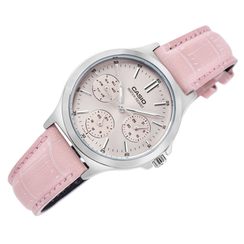 Zegarek CASIO z pastelowym, lakierowanym paskiem i różową tarczą to kwintesencja kobiecego stylu z nutą słodyczy. Jasnoróżowy, satynowo-perłowy odcień tarczy z delikatnym połyskiem łagodnie odbija światło, tworząc efekt miękkiej, kobiecej elegancji. Trzy subtarcze – dzień tygodnia, czas 24-godzinny i data dodają mu funkcjonalności bez utraty lekkości formy. Połyskująca koperta ze stali nierdzewnej pięknie kontrastuje z paskiem w odcieniu pudrowego różu, który przypomina delikatne akcenty z modowych wybiegów. Całość tworzy zegarek idealny – do zwiewnej sukienki czy różowej koszuli.