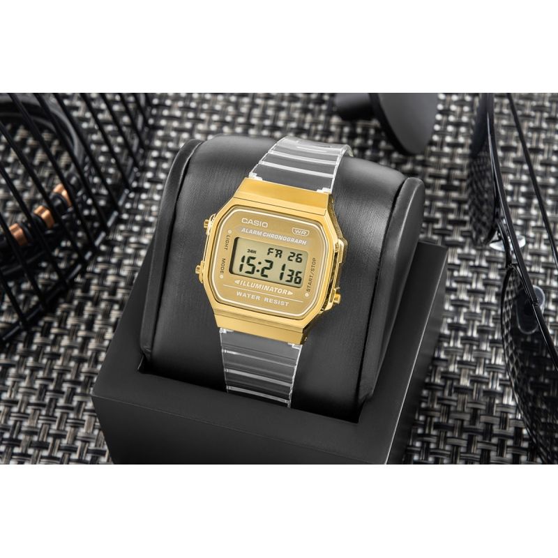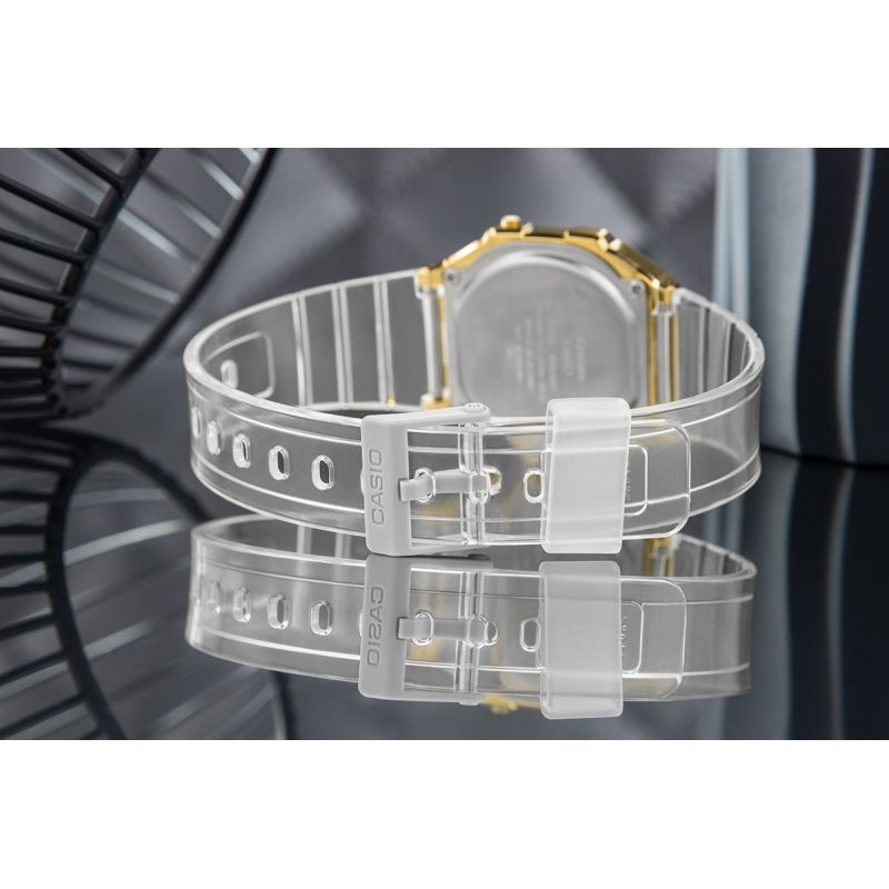 Model CASIO A168XESG to subtelny błysk złota, lekkość transparentnego paska i ponadczasowy kształt – czyli minimalizm z charakterem. Dla kobiet, które lubią styl z duszą i cenią dodatki, które opowiadają historię.