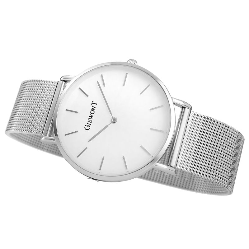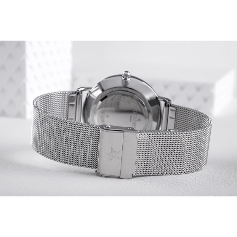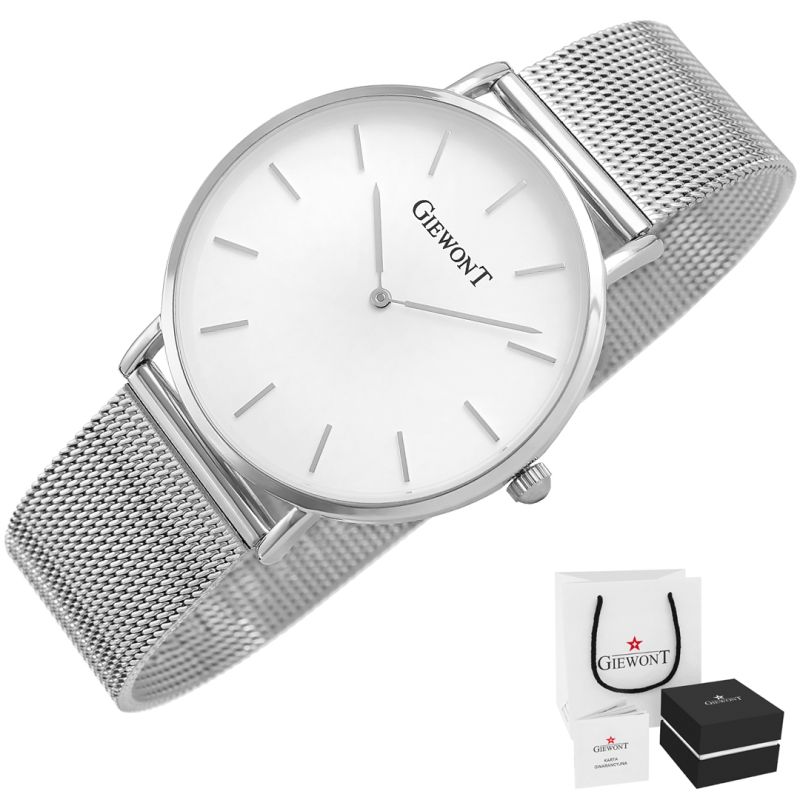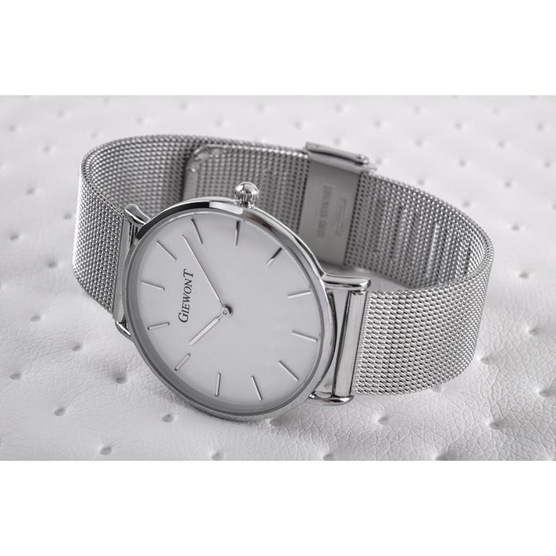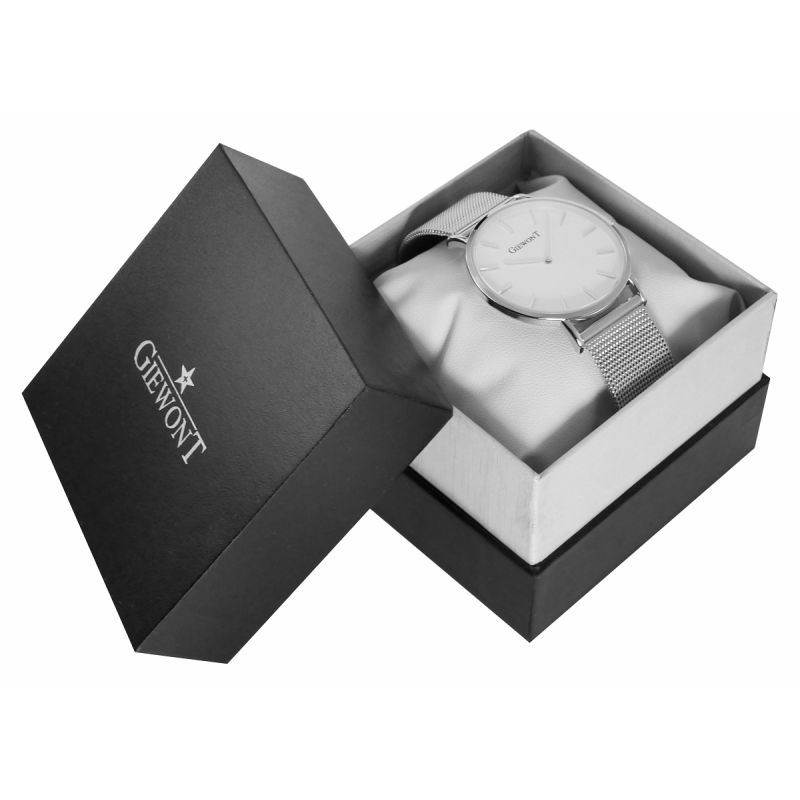 Komfortowa, stalowa bransoleta typu Mesh, to znakomite uzupełnienie tego zegarka. Rodzaj bransolety jest gwarancją solidności i wygody podczas codziennego użytkowania. Komfort dopełnia odpowiednia jakość stali, która komfortowo dopasowuje się do damskiego nadgarstka. Zapięcie sygnowane jest logiem marki Giewont, co podnosi prestiż zegarka i zapewnia wyjątkowość na tle innych marek zegarków.
