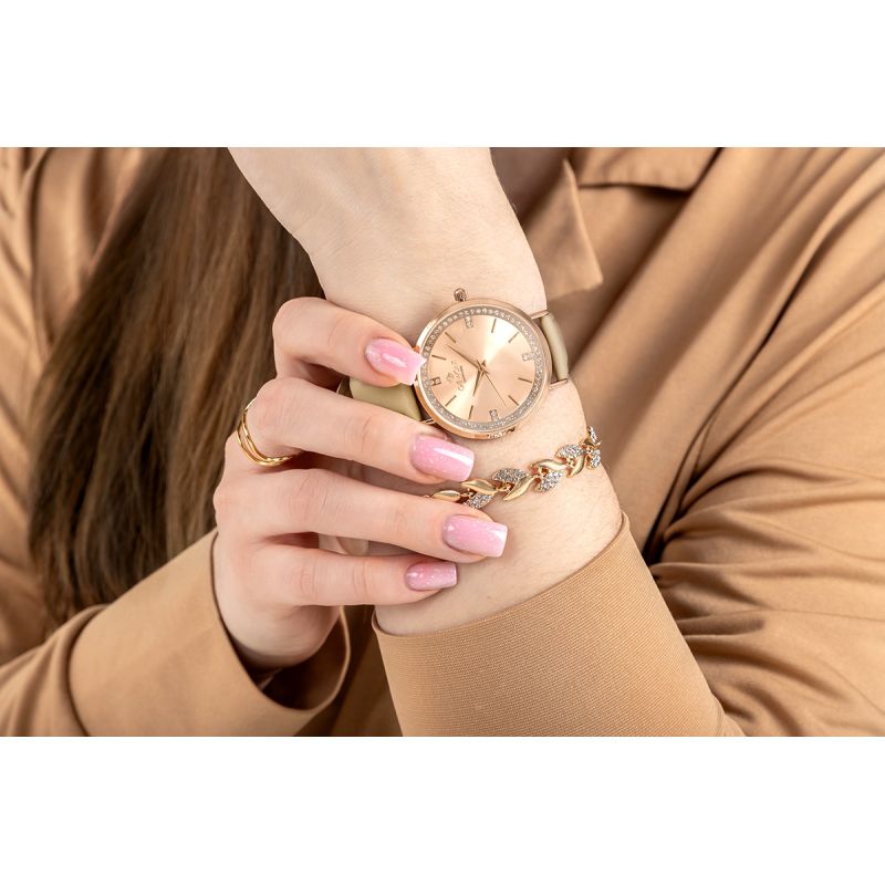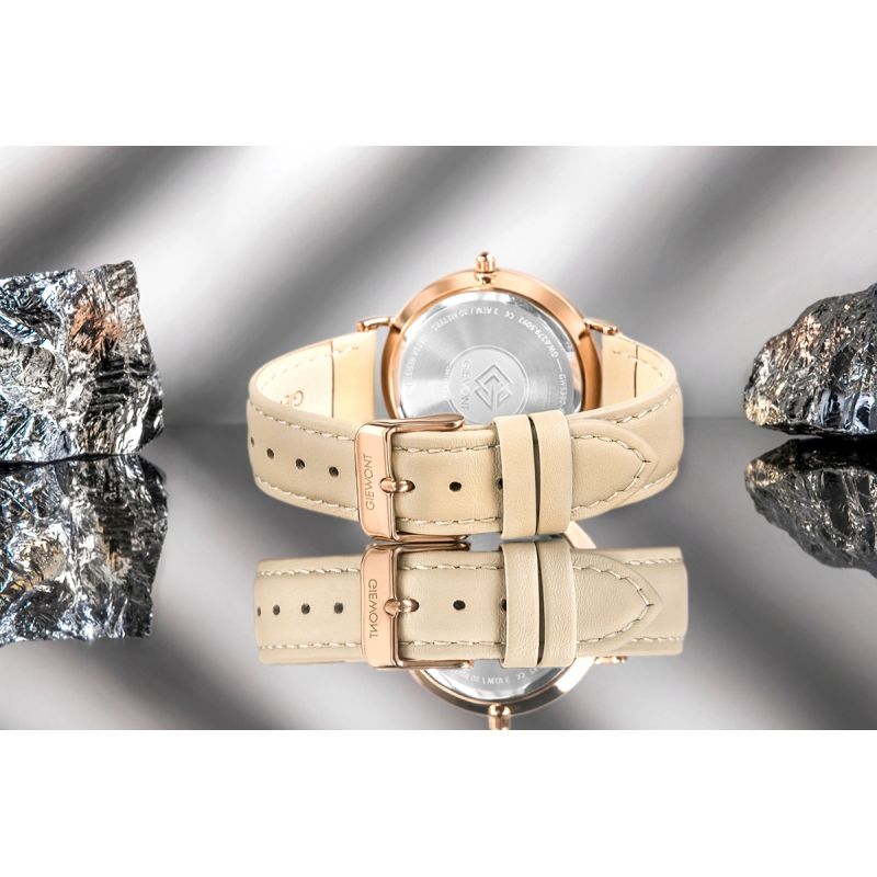 Starannie wykonany pasek ze skóry naturalnej stanowi eleganckie dopełnienie damskiego zegarka, podkreślając jego subtelny i kobiecy charakter. Miękka, przyjemna w dotyku skóra delikatnie układa się na nadgarstku, zapewniając wysoki komfort noszenia przez cały dzień. To element, który harmonijnie współgra z całością, dodając zegarkowi klasy i wyrafinowania.