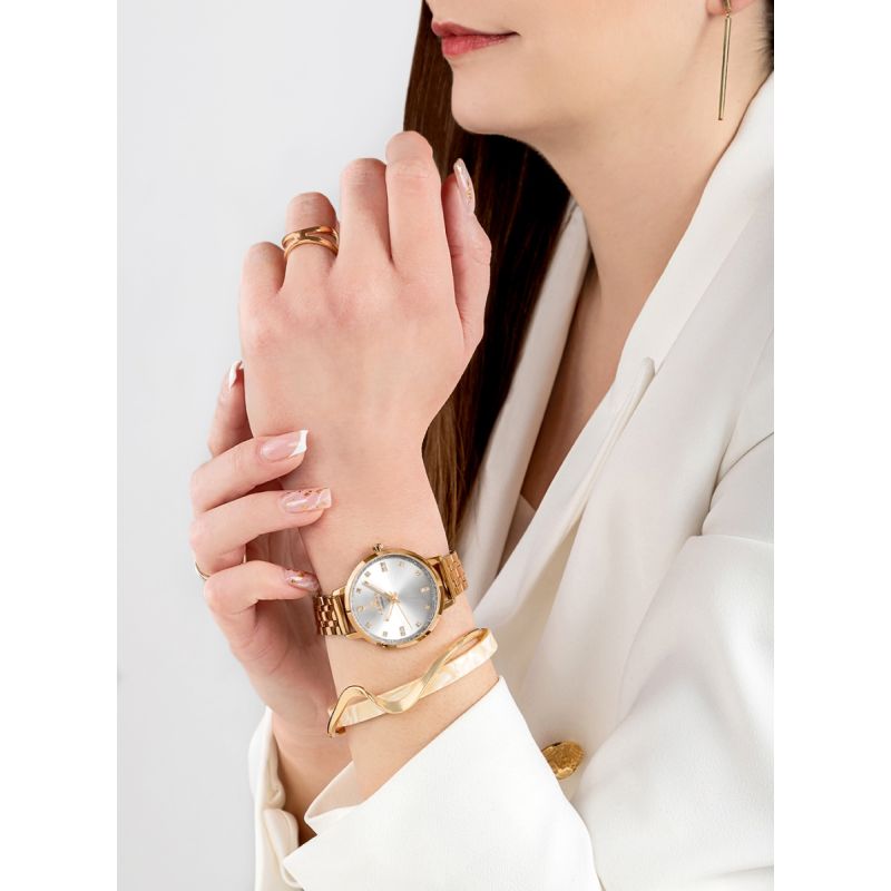 Mocna bransoleta wykonana z perfekcyjnie stali szlachetnej to element, który nie sposób przeoczyć. Każde ogniwo zostało zaprojektowane tak, by doskonale układać się na nadgarstku, zapewniając jednocześnie maksymalny komfort. Nieprzesadzona, doskonała w dotyku, wyrafinowana i solidna - jest jak stalowa obręcz, która mocno trzyma zegarek na Twoim nadgarstku, przypominając Ci o stabilności. Każde ogniwo jest starannie dopracowane, dzięki temu zegarek doskonale pasuje zarówno do codziennych, jak i formalnych stylizacji. Precyzyjnie wykonane zapięcie dopełnia ten mocny, kobiecy charakter zegarka.