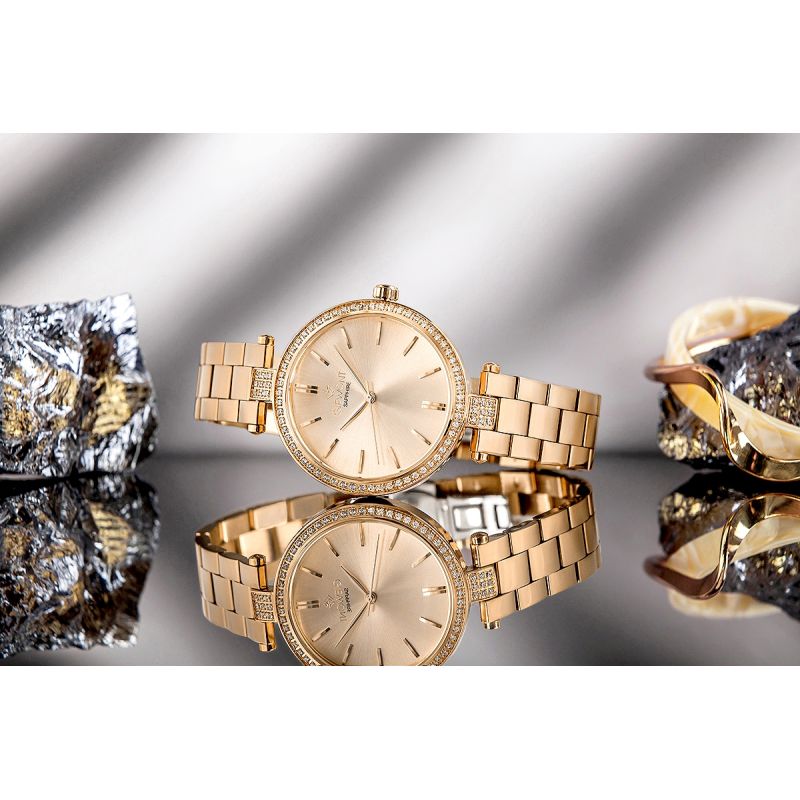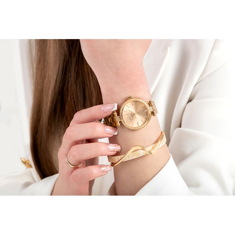Koperta została subtelnie zaakcentowana cyrkoniami, które delikatnie podkreślają jej kontur i dodają całości biżuteryjnej lekkości. Cyrkonie umieszczone również przy połączeniu koperty z bransoletą wprowadzają dyskretny blask, widoczny dopiero przy bliższym spojrzeniu. To detale, które nadają zegarkowi szlachetnego charakteru bez przesadnej dekoracyjności.