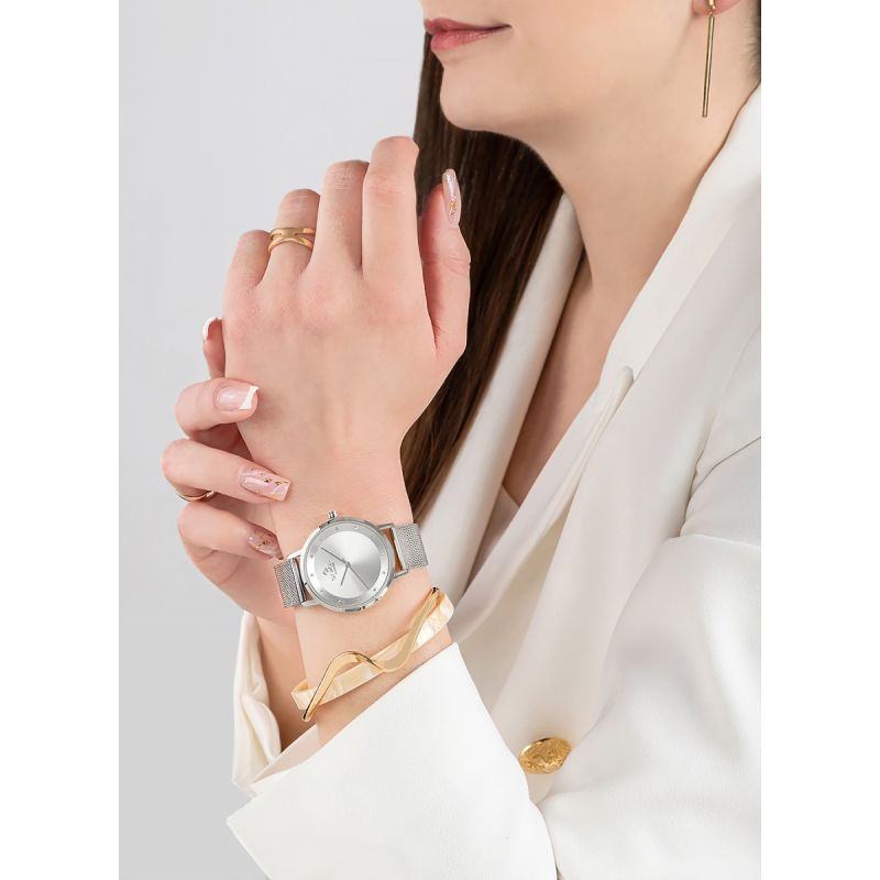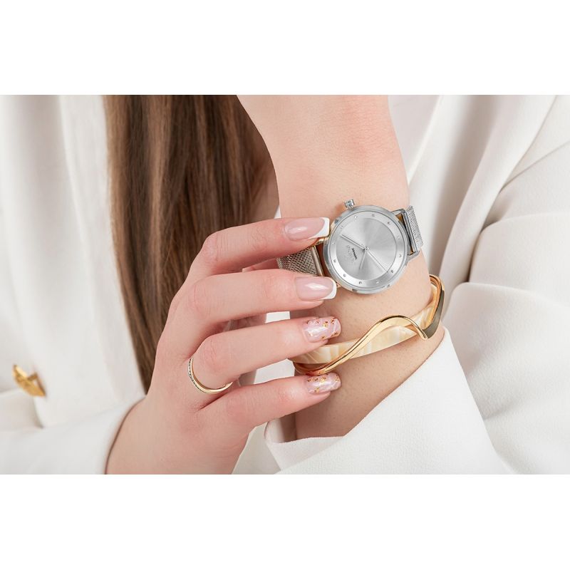 Delikatna bransoleta typu mesh wykonana z precyzyjnie splecionych metalowych włókien tworzy elegancki element, który przyciąga uwagę swoją lekkością. Jej drobna struktura sprawia, że idealnie dopasowuje się do nadgarstka, układając się miękko i naturalnie. Gładka w dotyku, finezyjna i niezwykle komfortowa, przypomina biżuterię stworzoną z myślą o codziennym noszeniu. Subtelny splot nadaje zegarkowi wizualnej lekkości, nie odbierając mu jednocześnie poczucia solidności. Dzięki swojej uniwersalnej formie bransoleta doskonale współgra zarówno z minimalistycznymi, jak i bardziej eleganckimi stylizacjami.