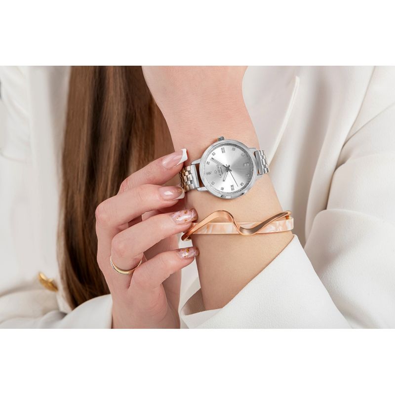Indeksy łączą w sobie precyzyjnie wykończone detale z delikatnym blaskiem cyrkonii, tworząc efekt subtelnej gry światła. Kamienie pełnią rolę biżuteryjnego akcentu, podkreślając elegancki charakter tarczy bez nadmiernej dekoracyjności. Dzięki temu zegarek zachowuje wyrafinowany, minimalistyczny wyraz.