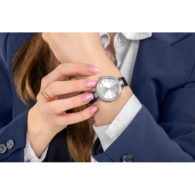 Kopertę otacza subtelny rząd cyrkonii, które tworzą delikatną oprawę przypominającą jubilerski pierścień. Kamienie dyskretnie połyskują przy każdym ruchu dłoni, nadając zegarkowi szlachetnego blasku i luksusowego wyrazu. Dodatkowe cyrkonie umieszczone przy połączeniach koperty z paskiem stanowią biżuteryjny detal, który przyciąga uwagę swoją precyzją i elegancją.