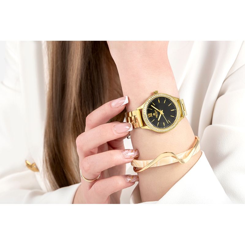 Tarcza została zaprojektowana z myślą o przejrzystości i estetycznej równowadze, dzięki czemu zegarek pełni nie tylko funkcję praktyczną, ale również biżuteryjną. Koperta ozdobiona subtelnymi cyrkoniami przyciąga wzrok i nadaje całości luksusowego charakteru, delikatnie podkreślając kobiecy styl bez nadmiernej ostentacji.