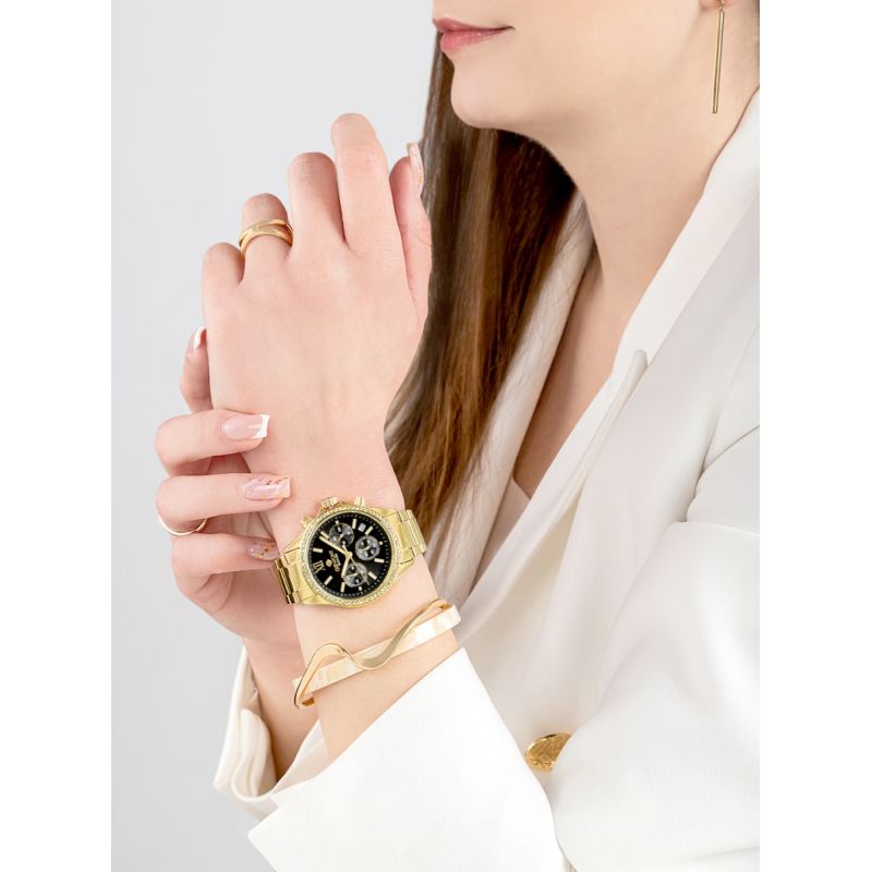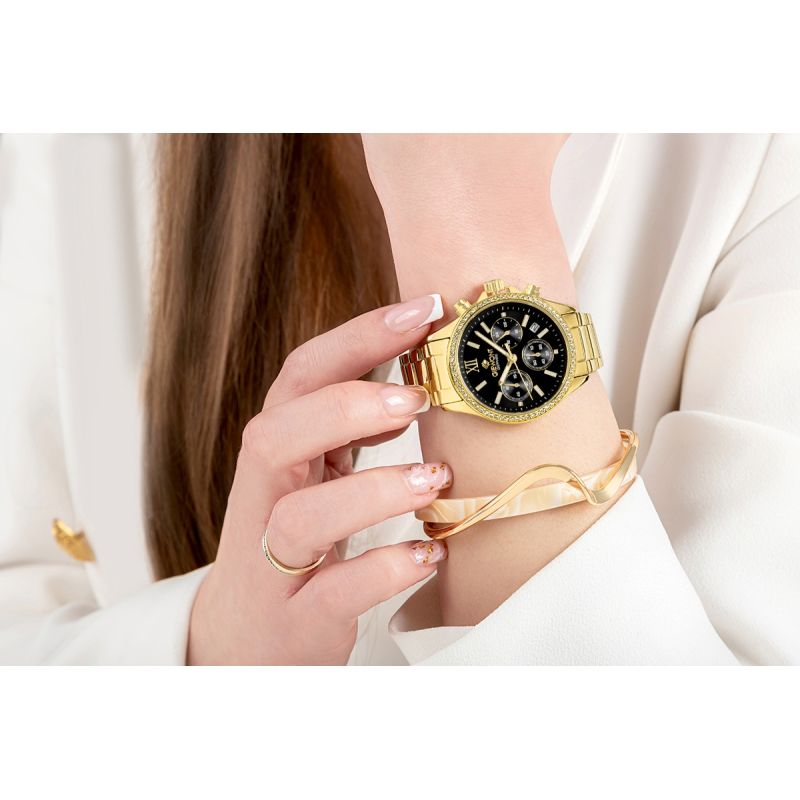 Zastosowane chronografy nadają tarczy dynamicznego charakteru, podkreślając nowoczesny styl zegarka. Funkcja czasu 24-godzinnego zwiększa jego praktyczność, a datownik dni miesiąca w naturalny sposób uzupełnia całość, zapewniając wygodę użytkowania na co dzień. Dzięki temu zegarek łączy estetykę biżuterii z funkcjonalnością, której można zaufać.