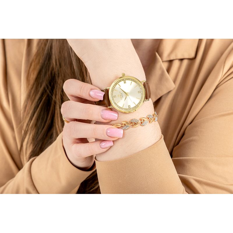 Starannie wykonany pasek ze skóry naturalnej stanowi eleganckie dopełnienie damskiego zegarka, podkreślając jego subtelny i kobiecy charakter. Miękka, przyjemna w dotyku skóra delikatnie układa się na nadgarstku, zapewniając wysoki komfort noszenia przez cały dzień. To element, który harmonijnie współgra z całością, dodając zegarkowi klasy i wyrafinowania.