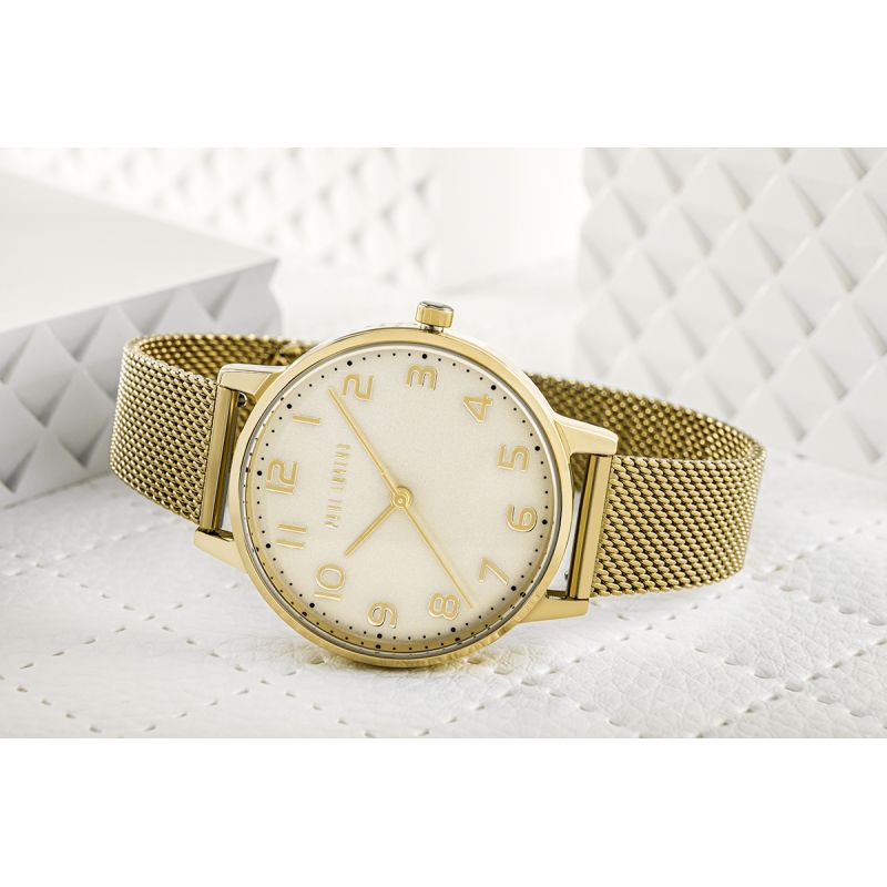 Zegarek w minimalistycznym stylu, osadzony w luksusowej złotej kolorystyce, to kwintesencja elegancji, która zachwyca prostotą i finezją. Jego wyrafinowany design w subtelny sposób podkreśla piękno kobiecej dłoni, a jednocześnie wprowadza do codziennych stylizacji odrobinę luksusu.Złota tarcza, pozbawiona zbędnych ozdób, skupia całą uwagę na złotych wskazówkach i precyzyjnym sekundniku, które z gracją suną po jej gładkiej powierzchni, tworząc zjawiskowy taniec światła. Minimalistyczne podejście do designu sprawia, że zegarek staje się nie tylko narzędziem do odmierzania czasu, ale także elegancką biżuterią, która przyciąga spojrzenia.