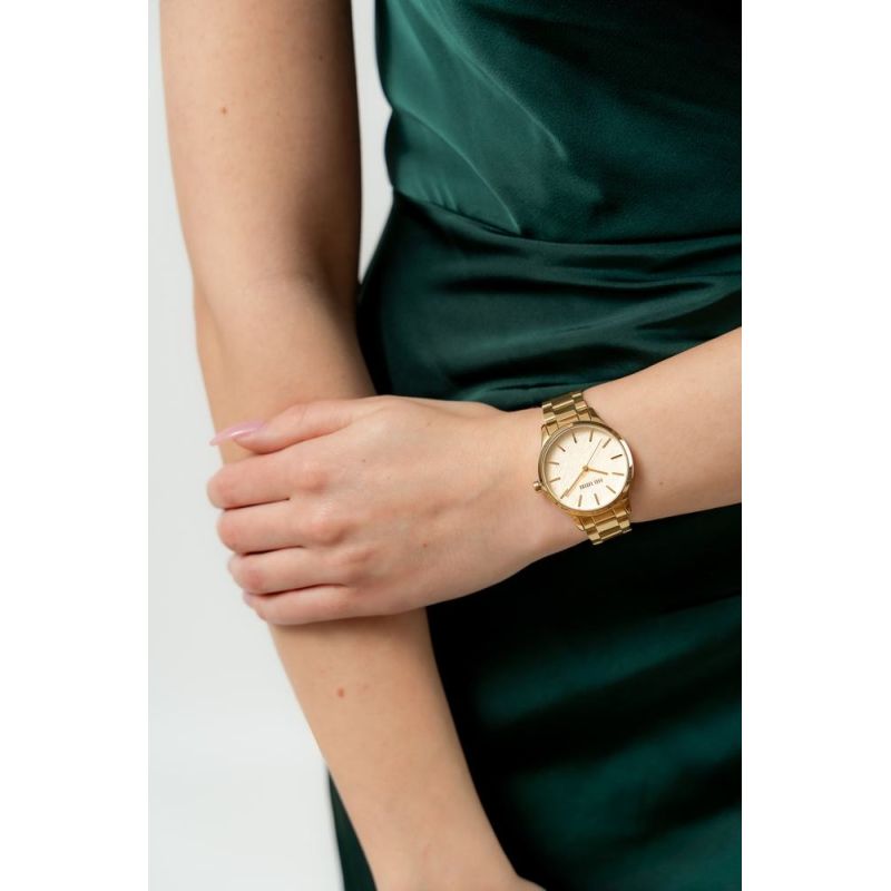 Jej gładka, delikatnie połyskująca powierzchnia harmonijnie oplata nadgarstek, zapewniając komfort noszenia przez cały dzień. Dziękiprecyzyjnemu wyprofilowaniu idealnie dopasowuje się do kobiecej dłoni, subtelnie podkreślając smukłość nadgarstka i dodając każdej stylizacji elegancji. Stal nierdzewna łączy w sobie zarówno wytrzymałość, jak i lekkość, co sprawia, że zegarek nosi się z wyjątkową wygodą. Design bransolety idealnie balansuje pomiędzy luksusem a codzienną prostotą, sprawiając, że ten model zegarka jest idealny zarówno na wieczorne wyjścia, jak i na co dzień. Całość dopełnia logo Paul Lorens na zapięciu bransolety.