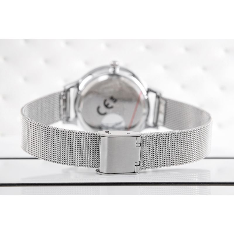 Ten zegarek to harmonijne połączenie klasyki i nowoczesności, które przyciąga wzrok swoją wyrazistością. Srebrna koperta otula białą tarczę, tworząc elegancką ramę dla czarnych indeksów, które, ozdobione cyrkoniami, delikatnie połyskują, dodając odrobiny luksusu. Czarne wskazówki i sekundnik, precyzyjnie przesuwające się po tarczy, tworzą mocny kontrast z jej jasnym tłem, zapewniając czytelność i stylowy wygląd.