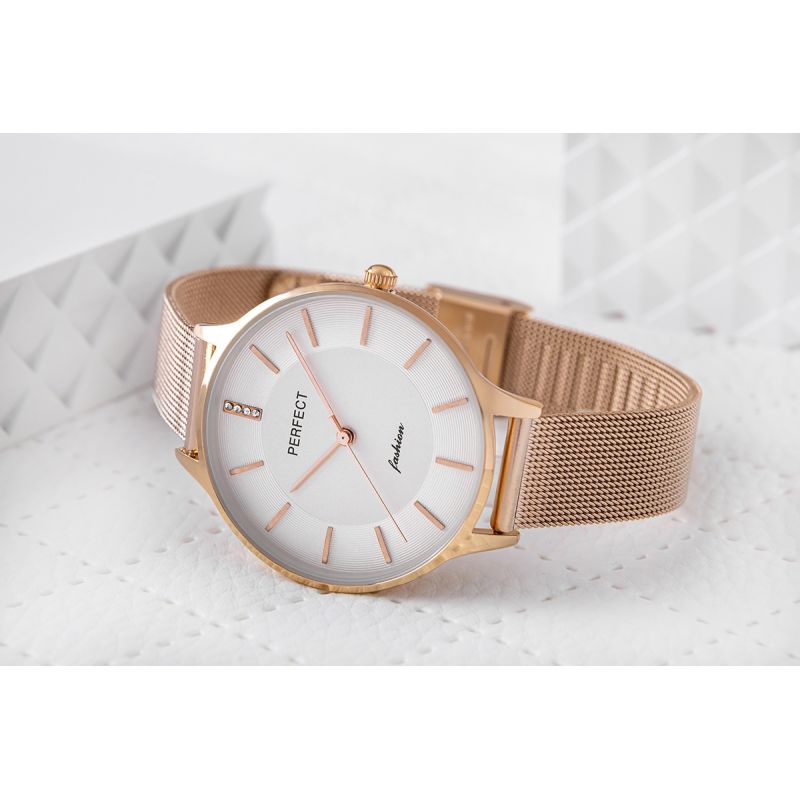 Wykonana z wysokiej jakości stali, idealnie dopasowuje się do damskiego nadgarstka, zapewniając wygodę noszenia przez cały dzień. Jej elegancka struktura i zapięcie ozdobione logiem marki Perfect dodają zegarkowi wyjątkowego stylu i wyróżniają go na tle innych.