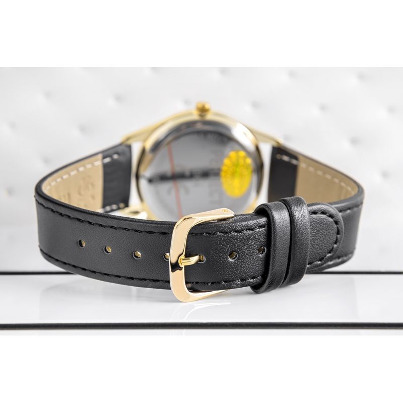 Czarny pasek, wykończony czarną nitką, nadaje nowoczesności, sprawiając, że zegarek idealnie pasuje do każdej stylizacji. To dodatek dla kobiety, która chce podkreślić swoją indywidualność i pewność siebie, przypominający, że każda chwila zasługuje na odrobinę luksusu.