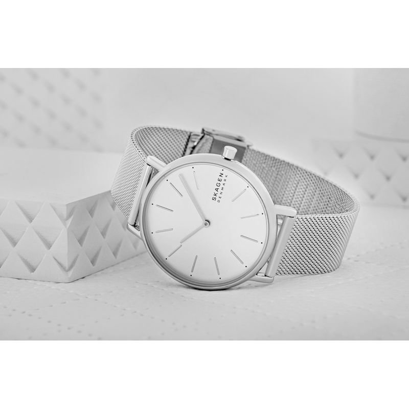 Zegarek damski SKAGEN z kolekcji Signatur to przykład doskonałej równowagi - czysta, przejrzysta tarcza, cienkie wskazówki i subtelne indeksy sprawiają, że zegarek nie przytłacza nadmiarem detali, a jednocześnie przyciąga uwagę wyrafinowaną prostotą. Skagen Signatur nie potrzebuje skomplikowanych zdobień, bo jego jakość i design bronią się same. To zegarek, który nie krzyczy o luksusie, ale go emanuje – w sposób naturalny i niewymuszony.