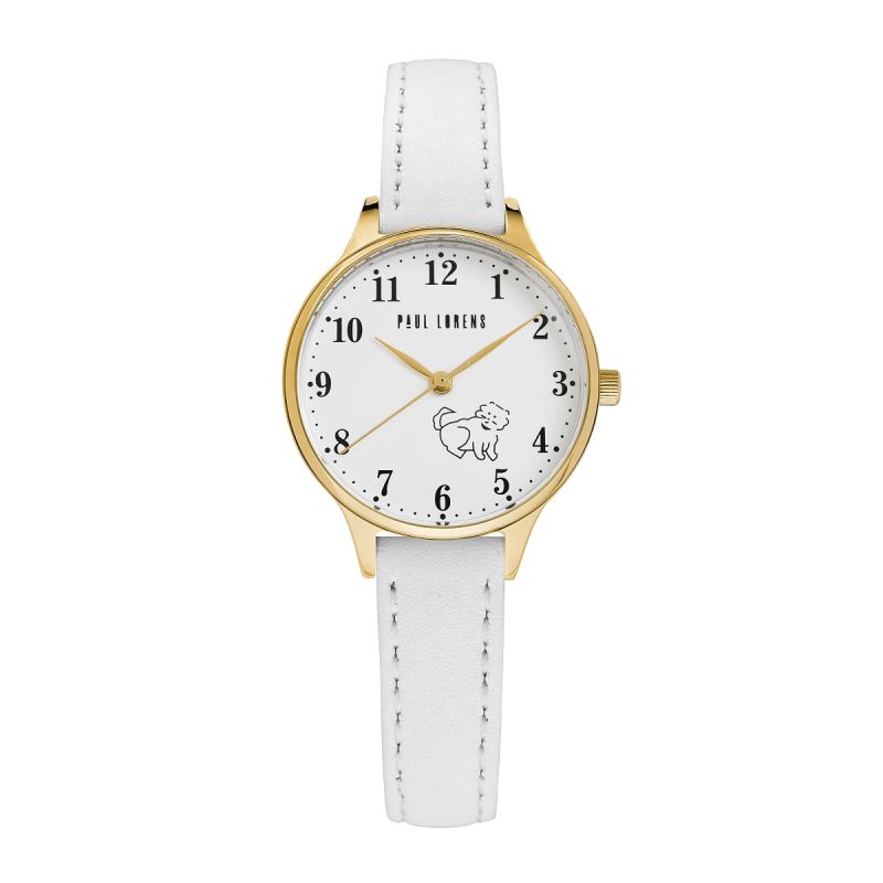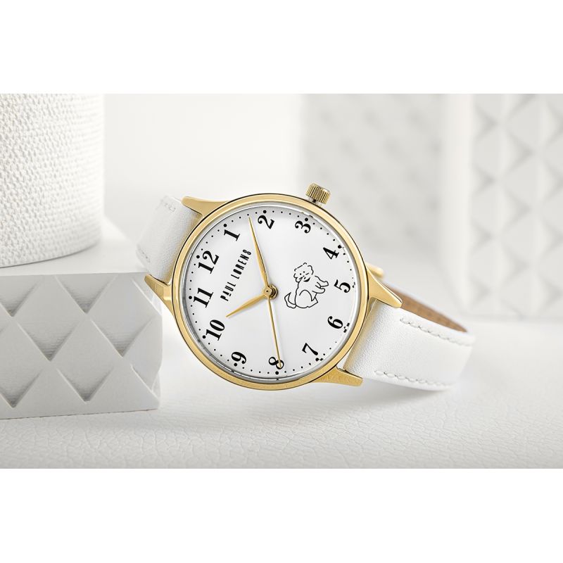 ZŁota koperta harmonijnie współgra z białą tarczą, na której widnieje uroczy wizerunek pieska, dodając zegarkowi radosnego charakteru. Ta subtelna grafika sprawia, że zegarek staje się wyjątkowym, osobistym akcesorium, które maluch będzie nosił z dumą. Złote wskazówki i indeksy dodają elegancji, a sprytnie zaprojektowany sekundnik, poruszający się z gracją, uczyni naukę odczytywania czasu przyjemnością i ekscytującą przygodą.