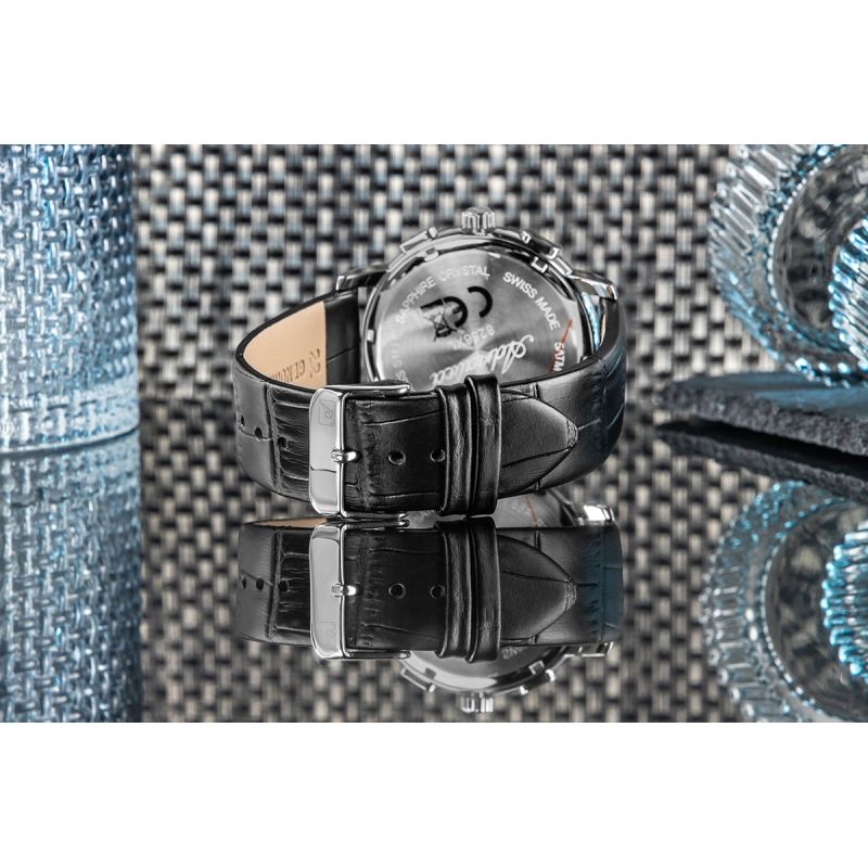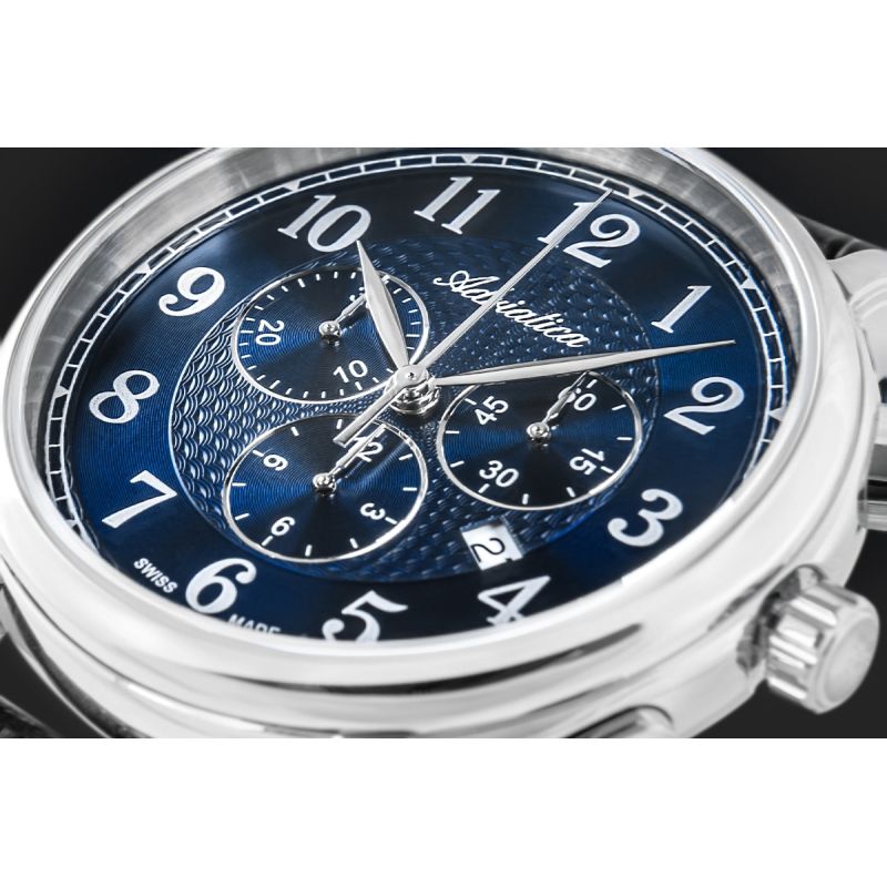 Męski Zegarek Adriatica A8256.5225CH to wyraz szacunku do klasyki, szwajcarskiej precyzji i kunsztu, który nie potrzebuje przesady, by przyciągać uwagę. W jego sercu pracuje niezawodny mechanizm kwarcowy Swiss Made, stworzony z myślą o codziennej funkcjonalności i perfekcyjnej punktualności – niezależnie od tempa, w jakim żyjesz. Trzy elegancko wkomponowane subtarcze chronografu dodają nie tylko funkcjonalności, ale też sportowej finezji – pozwalają mierzyć czas z dokładnością do sekundy, zachowując jednocześnie spójność wizualną z klasycznym układem zegarka. Wskazówki oraz cyfry arabskie są czytelne, a całość podkreśla delikatny połysk i elegancka struktura cyferblatu, która zmienia się subtelnie pod wpływem światła. Tarczę chroni szafirowe szkło, odporne na zarysowania, które zabezpiecza wszystko to, co najważniejsze. 42-milimetrowa koperta wykonana ze stali szlachetnej została wyprofilowana tak, by dobrze leżała na nadgarstku – mocna w formie, ale nieprzesadzona. Całości dopełnia klasyczny pasek z czarnej skóry naturalnej, z lekkim połyskiem i tłoczeniem przypominającym skórę krokodyla.