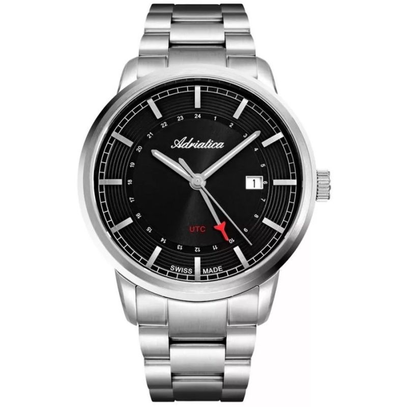 Męski zegarek Adriatica A8307.5114Q to esencja nowoczesnej elegancji zaklęta w głębokiej czerni, która przyciąga wzrok szlachetnym minimalizmem i siłą wyrazu. Jego czarna tarcza o wyrafinowanym, matowym wykończeniu została wzbogacona o subtelny pierścień z oznaczeniami 24-godzinnymi, nadając całości funkcjonalnej głębi i charakterystycznej struktury. Model ten wyposażono w cztery wskazówki – w tym dodatkową GMT zakończoną czerwonym grotem – co umożliwia jednoczesne śledzenie czasu w drugiej strefie czasowej lub w trybie 24h. To rozwiązanie praktyczne, a zarazem estetyczne, podkreślające dynamiczny, męski styl życia. Wskazówki główne i indeksy godzinowe pokryto warstwą luminescencyjną, gwarantując doskonałą czytelność niezależnie od pory dnia. Harmonijnie wkomponowany datownik przy godzinie trzeciej zapewnia praktyczną funkcję bez zaburzania symetrii cyferblatu. Całość chroniona jest przez wysokiej klasy szkło szafirowe, odporne na zarysowania – rozwiązanie, które doceni każdy, kto ceni trwałość i estetykę. Koperta zegarka oraz masywna, stalowa bransoleta o satynowym wykończeniu tworzą spójną i wyrazistą formę.