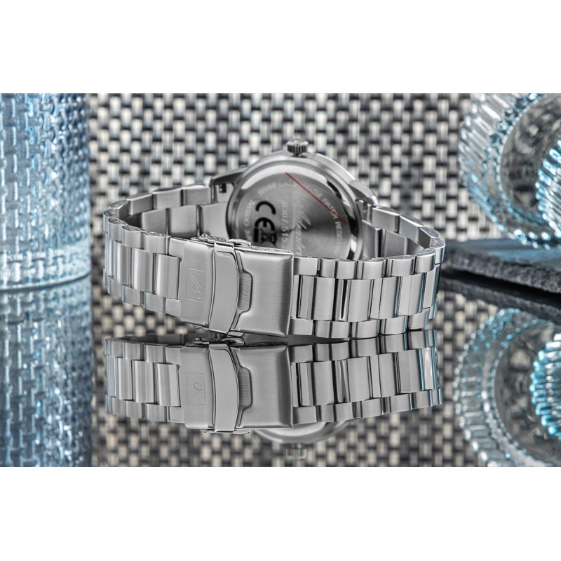 Wykonana z doskonałej stali nierdzewnej, która łączy trwałość z luksusowym wykończeniem Jej solidna konstrukcja to nie tylko gwarancja niezawodności, ale także pewność, że zegarek będzie leżeć idealnie, niezależnie od tego, co przyniesie dzień. Precyzyjne zapięcie z wytłoczonym logo dopełnia całości, dodając nutę klasy i wyjątkowego charakteru.