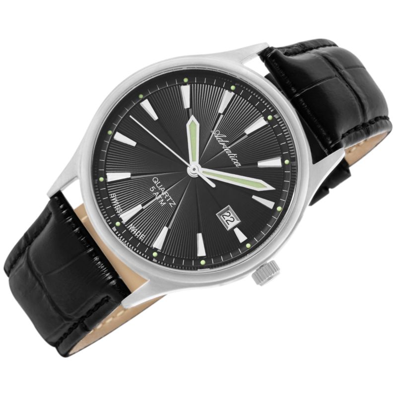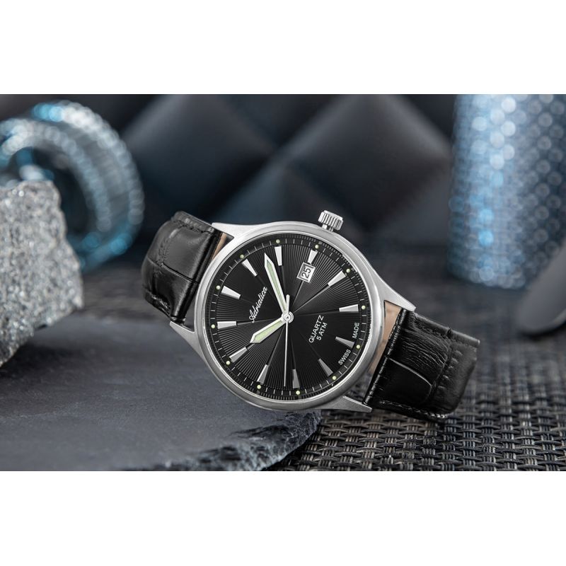 Model Adriatica A1171.4214Q to wyważone połączenie tradycyjnego stylu, precyzyjnego mechanizmu Swiss Made oraz tytanowej koperty, która jest nie tylko trwała, ale niemal niewyczuwalna na nadgarstku. W sercu zegarka pracuje mechanizm kwarcowy Swiss Made – sprawdzony, precyzyjny, gotowy, by służyć przez lata, bez względu na to, jak intensywny bywa Twój dzień. Trzy wskazówki – godzinowa, minutowa i sekundowa – poruszają się płynnie po subtelnie gliszowanej tarczy w odcieniu głębokiej czerni z połyskiem, której minimalistyczne indeksy dodają całości wyrafinowanego charakteru. Nie znajdziesz tu nadmiaru ozdobników – to design, który nie potrzebuje krzykliwych akcentów, by robić wrażenie. Tarczę osłania odporne na zarysowania szafirowe szkło, które skutecznie chroni to, co najważniejsze – estetykę, precyzję i spójność formy. Całość zamknięto w 41-milimetrowej kopercie z tytanu – wystarczająco wyrazistej, by zaznaczyć obecność na nadgarstku, ale na tyle smukłej, by z łatwością wsunąć się pod mankiet koszuli. Całość dopełnia klasyczny, czarny pasek ze skóry naturalnej, który z czasem nabierze jeszcze więcej charakteru.
