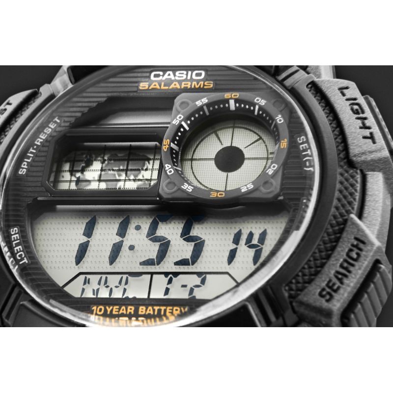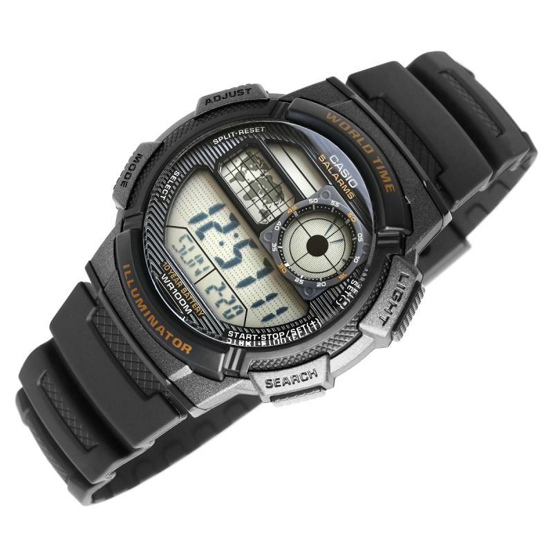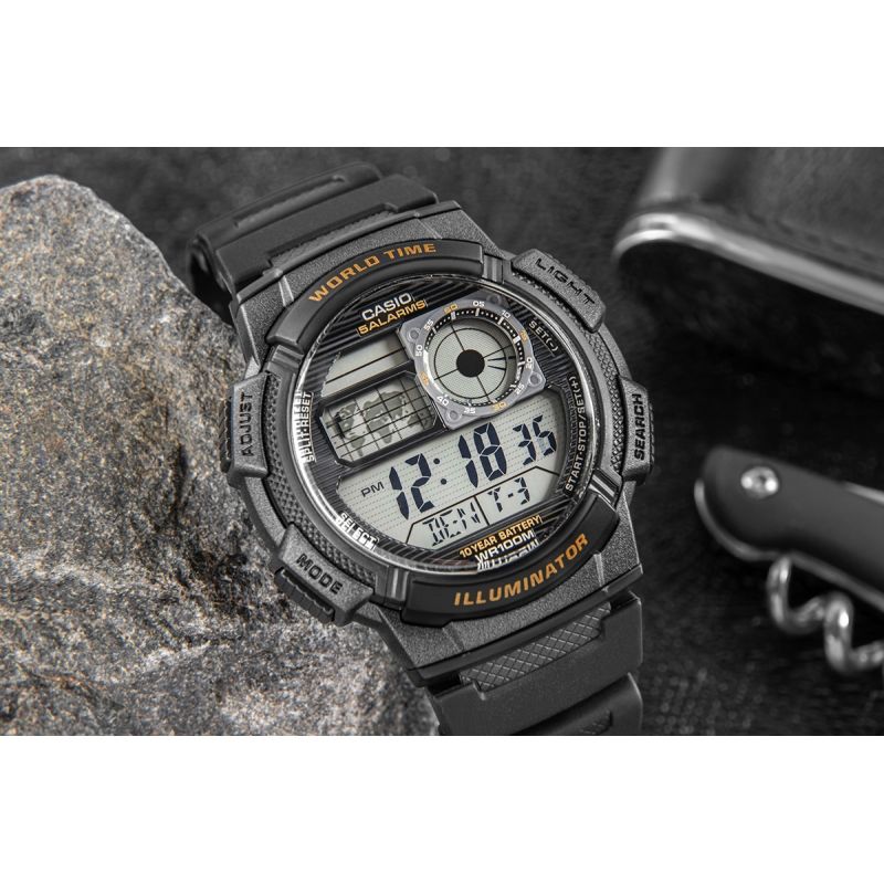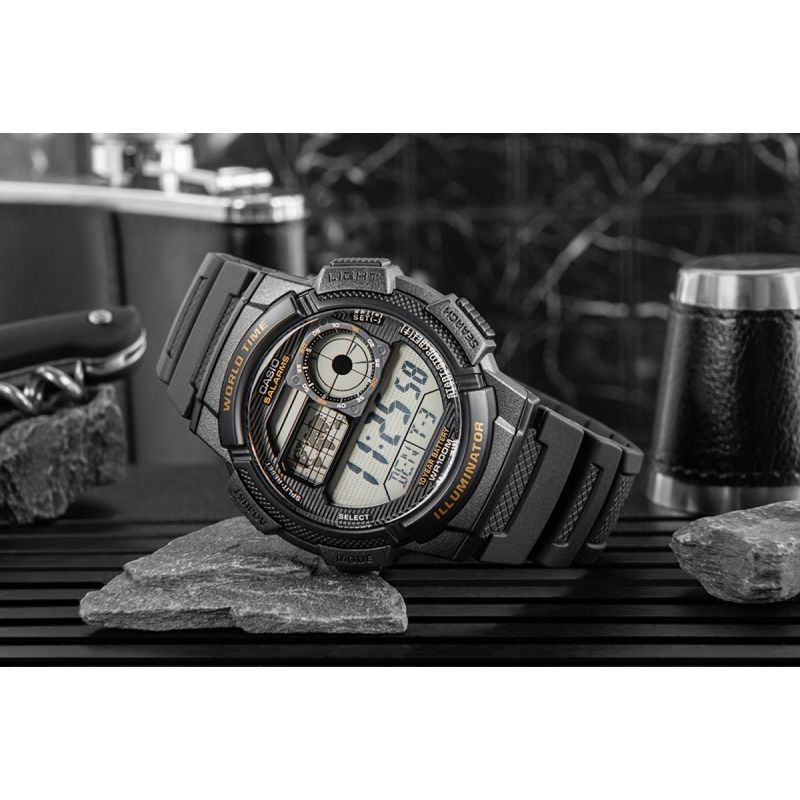 Model CASIO z Multi Time, światowym czasem, stoperem, alarmem x 5 i minutnikiem - a to wszystko 10 lat na jednej baterii. Casio AE-1000W to zegarek, który nadąża za Tobą - tarcza inspirowana kokpitem samolotu nadaje mu surowy, techniczny charakter, który podkreśla męski styl i dynamiczny tryb życia. Dzięki mapie świata i funkcji World Time możesz jednym rzutem oka sprawdzić czas w różnych strefach, co sprawia, że to idealny wybór dla podróżników i profesjonalistów pracujących na międzynarodową skalę. Wyświetlacz LC Analog sprawia, że zawsze masz pod ręką godzinę swojego miasta domowego, a wodoodporność do 100 metrów pozwala na swobodne użytkowanie zegarka w trudniejszych warunkach. To zegarek dla mężczyzn, którzy oczekują więcej – precyzji, trwałości i stylu.