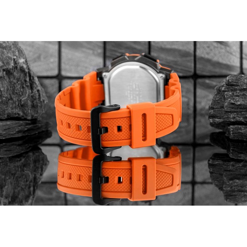 Dzięki 5 alarmom dziennym lub jednorazowym oraz sygnałowi godzinowemu zapewnia pełną kontrolę nad czasem. Podświetlenie LED z możliwością wyboru czasu świecenia i efektem poświaty w bursztynowym kolorze ułatwia korzystanie w ciemności. Pełny kalendarz automatyczny działa aż do 2099 roku, a funkcja wyciszenia pozwala na wyłączenie dźwięków przycisków. Dokładność zegarka wynosi ±30 sekund na miesiąc, a dodatkowe funkcje obejmują format 12-/24-godzinny oraz standardowe wskazanie czasu (godzina, minuta, sekunda, PM, miesiąc, data, dzień tygodnia).