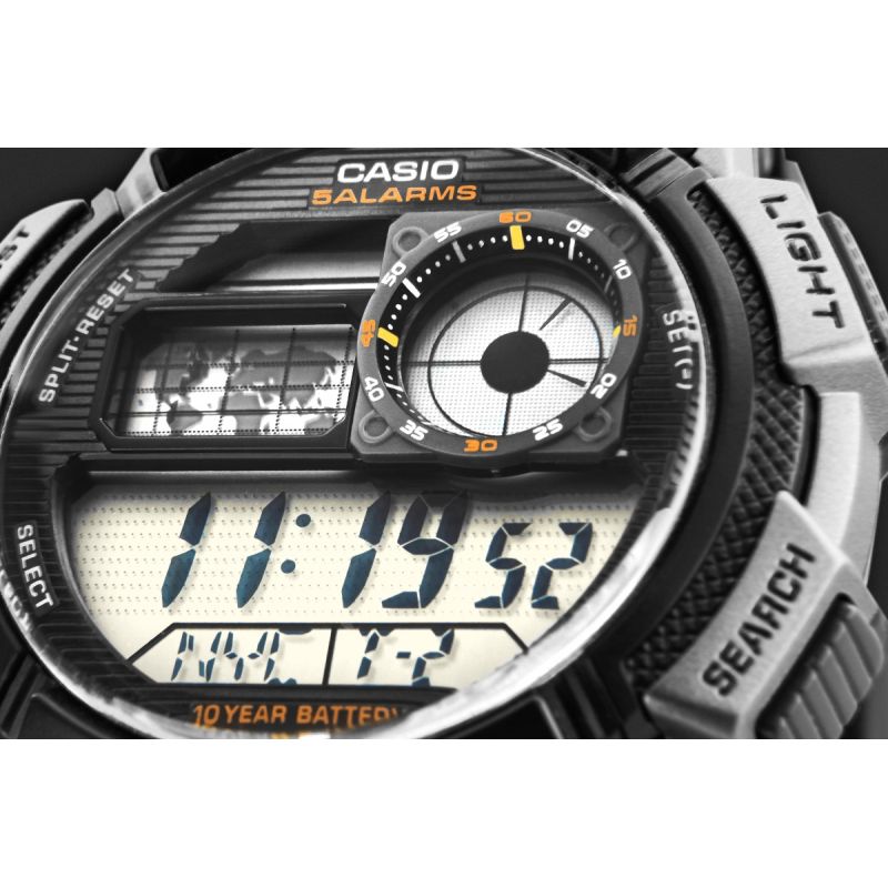 Model CASIO z Multi Time, światowym czasem, stoperem, alarmem x 5 i minutnikiem - a to wszystko 10 lat na jednej baterii. Casio AE-1000W to zegarek, który nadąża za Tobą - tarcza inspirowana kokpitem samolotu nadaje mu surowy, techniczny charakter, który podkreśla męski styl i dynamiczny tryb życia. Dzięki mapie świata i funkcji World Time możesz jednym rzutem oka sprawdzić czas w różnych strefach, co sprawia, że to idealny wybór dla podróżników i profesjonalistów pracujących na międzynarodową skalę. Wyświetlacz LC Analog sprawia, że zawsze masz pod ręką godzinę swojego miasta domowego, a wodoodporność do 100 metrów pozwala na swobodne użytkowanie zegarka w trudniejszych warunkach. To zegarek dla mężczyzn, którzy oczekują więcej – precyzji, trwałości i stylu.
