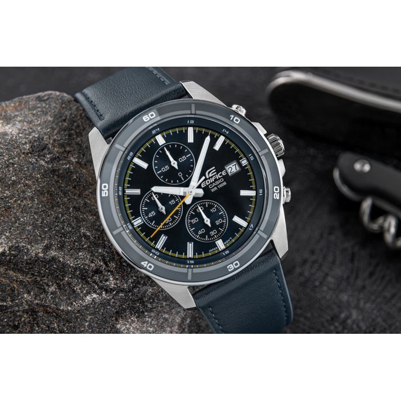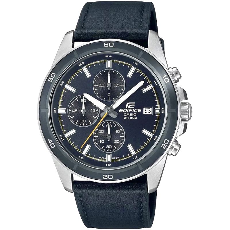 Wybierz idealne połączenie stylu i funkcjonalności z klasycznym, średniej wielkości chronografem EDIFICE. Pasek z prawdziwej skóry doskonale komponuje się z tarczą w ciemnych odcieniach szarości, inspirowaną miejskim, dynamicznym stylem jazdy. Model wyposażony w funkcję daty dni miesiąca oraz chronografy: stoper 1/10 sekund, sekundnik, stoper minut. Dzięki wodoszczelności 10 BAR możesz śmiało zabrać go na basen, trening czy wodną przygodę. Fluorescencyjne podświetlenie sprawia, że nawet po zmroku masz pełną kontrolę nad czasem.