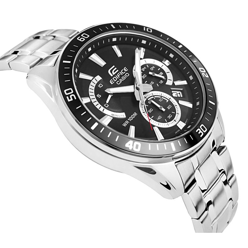 Duży, standardowy chronograf EDIFICE z retrogradą umieszczoną na pozycji godziny 10. Czarny bezel i tarcza wyróżniają się wyrazistym, dynamicznym designem, podkreślając sportowy charakter zegarka. Wyposażony w funkcję daty dni miesiąca oraz chronografy:stoper sekund, minut oraz chronograf 24h. Dzięki wodoszczelności 10 BAR możesz śmiało zabrać go na basen, trening czy wodną przygodę, a fluorescencyjne podświetlenie sprawia, że nawet po zmroku masz pełną kontrolę nad czasem.