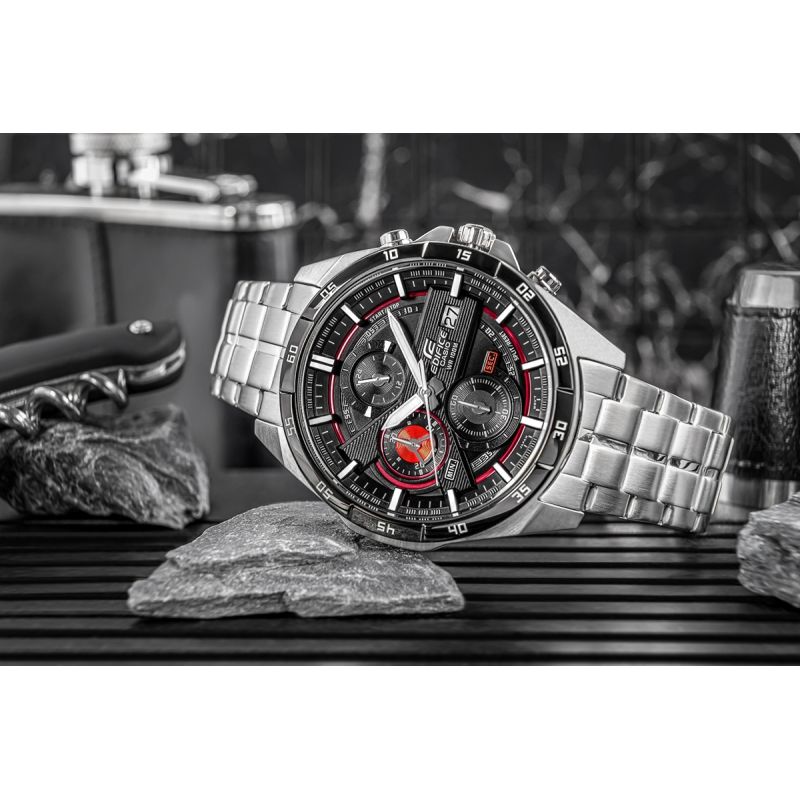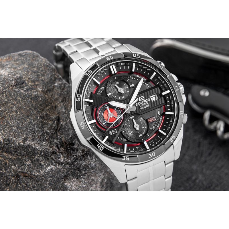 Duży, standardowy chronograf EDIFICE. Jego główną cechą jest dynamiczny design dwuwarstwowej, trójwymiarowej tarczy. Połączenie czerni z czerwonymi metalicznymi detalami na tarczy nadaje zegarkowi elegancki, a jednocześnie sportowy charakter. Wyposażony w funkcjędaty dni miesiąca oraz chronografy:stoper sekund, minut oraz chronograf 24h. Dzięki wodoszczelności 10 BAR możesz śmiało zabrać go na basen, trening czy wodną przygodę, a fluorescencyjne podświetlenie sprawia, że nawet po zmroku masz pełną kontrolę nad czasem.