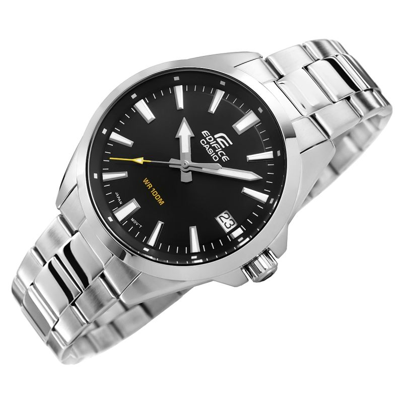 Ten elegancki zegarek EDIFICE wyposażony jest w wydłużone, mocowanie koperty z bransoletą, które zapewniają wygodne dopasowanie do nadgarstka. Czytelność wskazań zwiększa charakterystyczna, strzałkowa wskazówka godzinowa, która wyróżnia się na tarczy, ułatwiając szybkie odczytanie czasu. Dodatkowo, model posiada funkcję kalendarza, łącząc styl z praktycznością. Połączenie precyzyjnego mechanizmu kwarcowego z solidną stalą nadaje zegarkowi nowoczesny i elegancki charakter. Dzięki wodoszczelności 10 BAR możesz swobodnie korzystać z niego w wodzie, a fluorescencyjne podświetlenie gwarantuje czytelność nawet w ciemności.